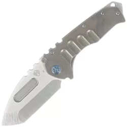 Praetorian T T/E Gray Titanium, Blue HW/Clip, Tumbled to flagowy, customowy folder MKT z ręcznie wykonanym szlifem wklęsłym, który podoła najcięższym zadaniom. To rzadkość w branży nożowej niewielu producentów potrafi ręcznie wykonać szlif wklęsły.