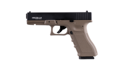 Niksan Defense NKS GL17, wiatrówka CO2 na kulki BBs, wierna replika pistoletu Glock 17. Wersja z metalowym, ruchomym zamkiem z systemem blowback odwzorowującego pracę prawdziwej broni. Wersja w kolorze piaskowym