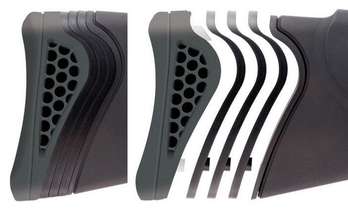 Settlement - ergonomic with thumbhole (TH - thumbhole), made of durable polymer in black color. Fluting on the pistol grip and in the center of the bed provides a secure grip and serves a decorative function. On the flask there is a contoured cheek pad of the monte carlo type that makes it easier to fold up to shoot as well as to aim. The flask is adapted for both right and left-handed people. Vented TrioPad® rubber foot (three types of interchangeable feet) at the end of the flask allows you to adjust the length of the flask and absorb the recoil energy after a shot is fired.
