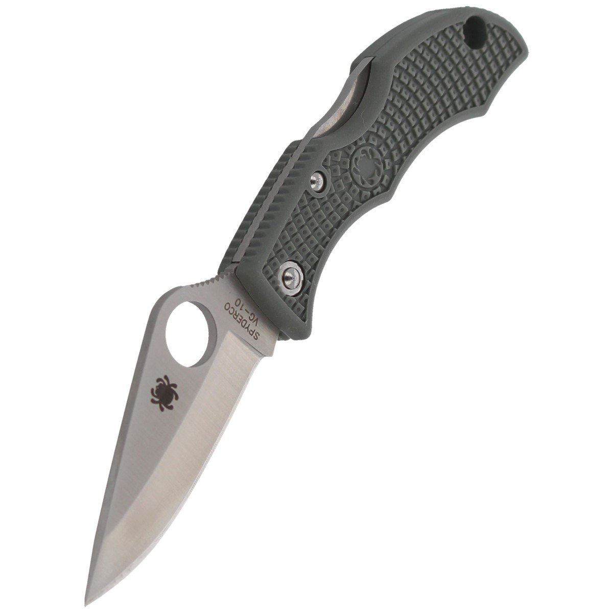 Blade - with a Clip Point profile, thickness 2.5 mm, made of Japanese stainless steel VG-10 (easy to sharpen, with good sharpness). The blade is hardened in the range of 59-61 HRC. Smooth blade (Plain type) was made with a Saber Grind cut. This cut has reduced the weight of the knife and improved cutting properties. The Satin Finish (semi-matte) coating eliminates glares. The SpyderHole round cut-out (Spyderco patent) allows you to open the knife with your thumb. Blade lock (Back-Lock) with an additional Boye Detent cutout, preventing accidental release of the lock with a strong grip of the knife. Notched thumb ramp.