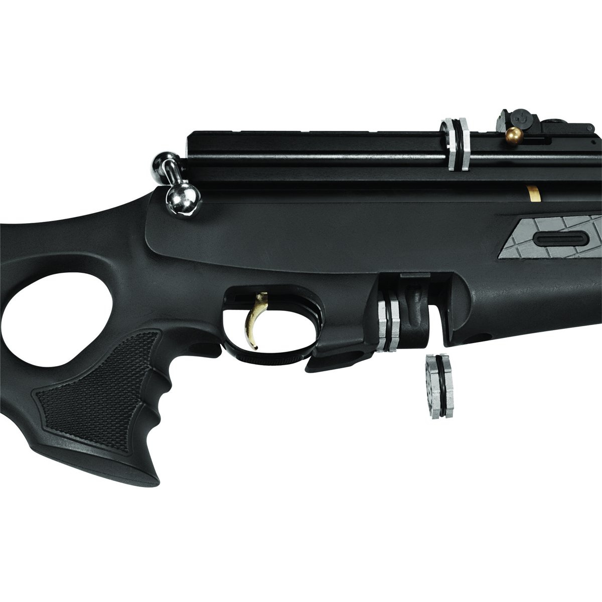 Accessory equipment - metal spinning tops for suspension mounting. Cap / adapter (air cylinder discharging cap) for draining the pressure from the cartridge. Tip Quick-Fill allowing the cartridge to be quickly filled with air using the hatsan Hand Pump, technical cylinder or dive (300 bar).