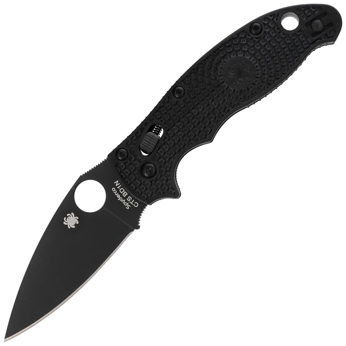 Blade - with Leaf-Shaped profile, thickness 3.2 mm. Covered with a scratch-resistant matte non-reflective DLC (Diamond Like Coating) coating in black color. Smooth blade (Plain type) was made with a full flat cut (Full Flat Grind). The flat cut provides excellent cutting edge geometry with a sharp tip and reduces the weight of the knife. An enlarged 14 mm round SpyderHole cut-out (Spyderco patent) makes it easier to open the knife in the glove. The notched thumb ramp and the Finger Choil undercutting the index finger between the handle and the cutting edge increase the control of the knife.