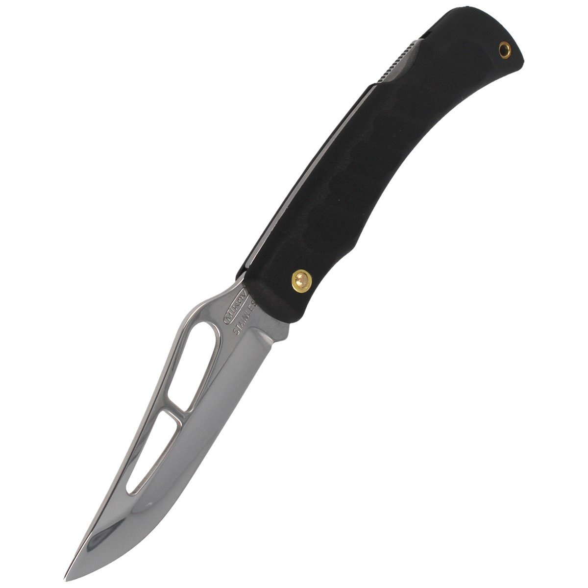 Blade - Clip Point type, slim and sharp, finished impressively in Mirror Finish. Plain blade is led out with concave grind (Hollow Grind) providing geometry and strength and allowing effective and deep cuts. On the back of the blade, a convenient ramp (spine) positions the thumb, gives solid support and makes it easier to operate the folder. Oval cutout for quick opening of the blade with the thumb, even when wearing a glove. Solid blockade: Back-Lock type.