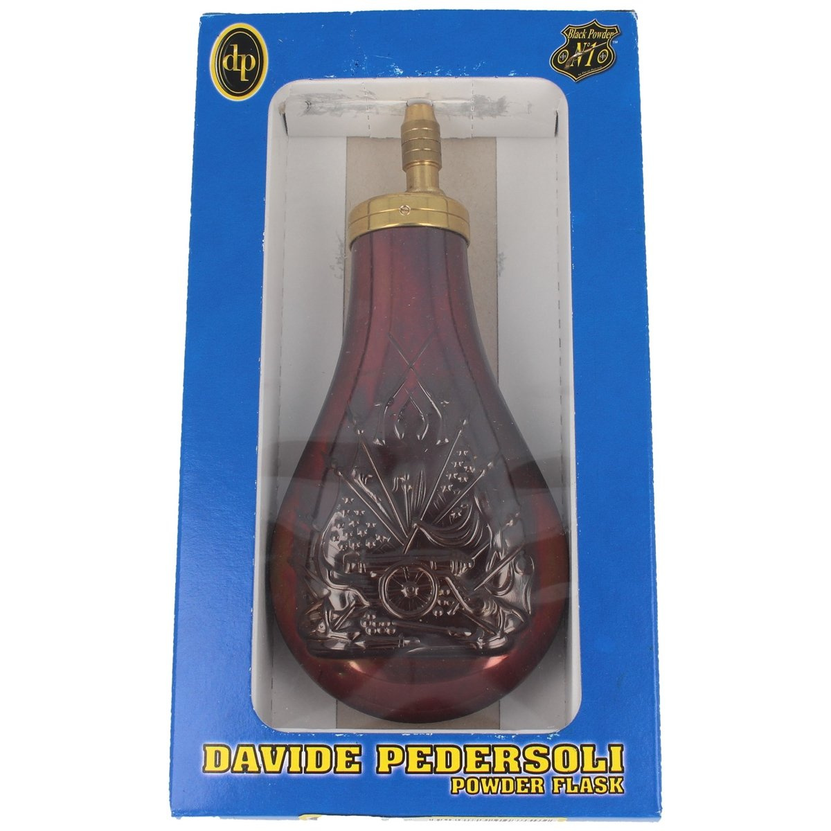 • DP520 Colt Pattern Powder Flask by Davide Pedersoli features an adjustable spout for precise powder measuring. For black powder firearms of various calibers, including rifles, pistols, revolvers. Made of lacquered copper and decorated battle scene motif.