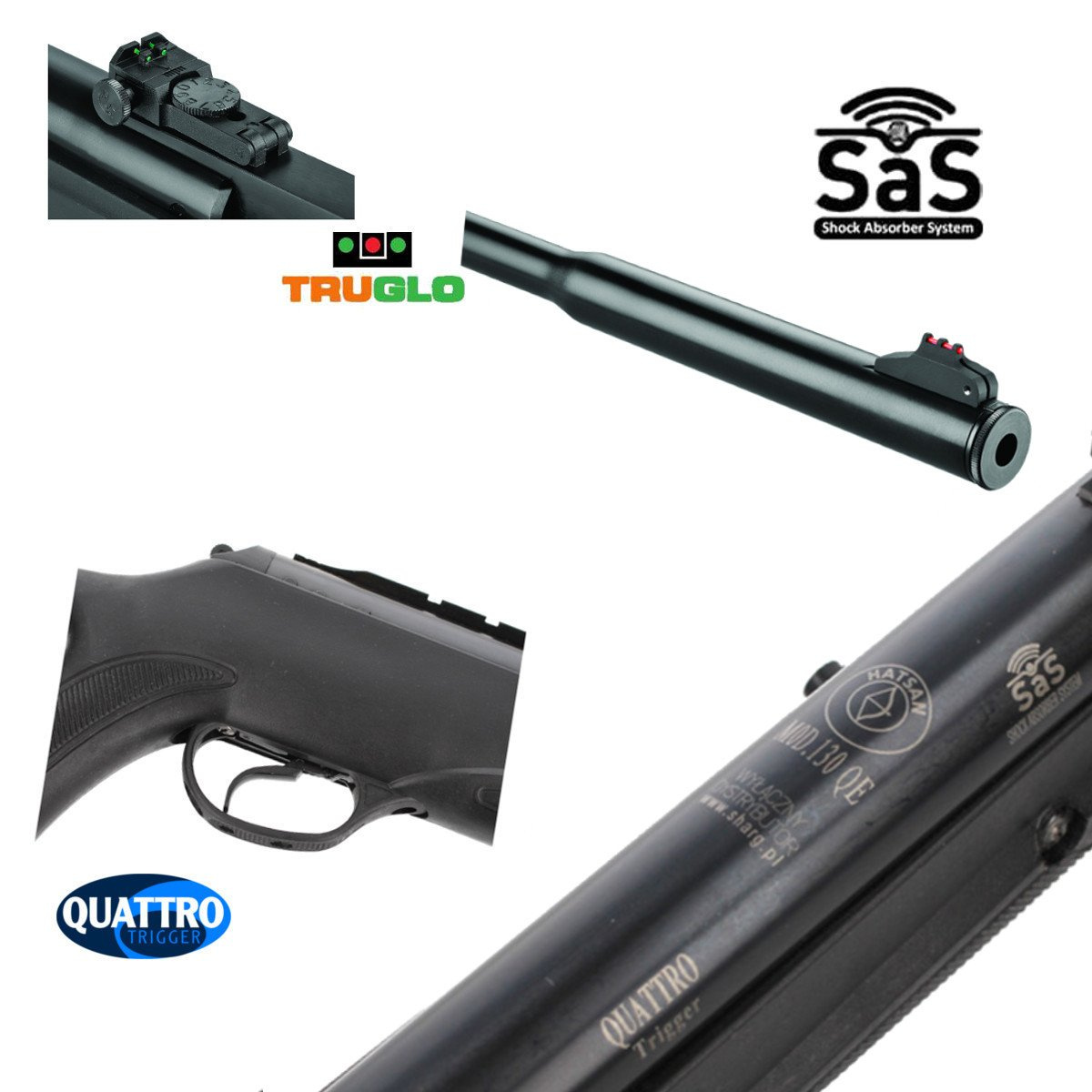 MOD 130QE, piston air rifle from the company Hatsan Arms in calibre .30 (7.62 mm) with broken qE barrel with integrated silencer. Caliber Big Bore 7.62 mm will allow you to rediscover the pleasure of air rifle shooting. Power, range, precision have another dimension here. For those who are looking for a good, solid and accurate carbine wide-ranging.