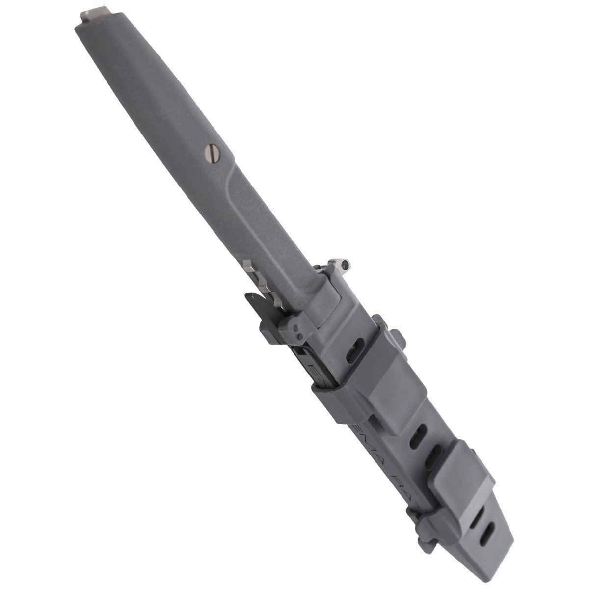 Sheath - light, made of nylon material in the color Wolf Grey. The versatile openwork Aspis holster protects the knife against falling out (latch) and makes it easier to dry the blade. The system of two adjustable multi-position clamps enables quick attachment of the sheath to M.O.L.L.E.