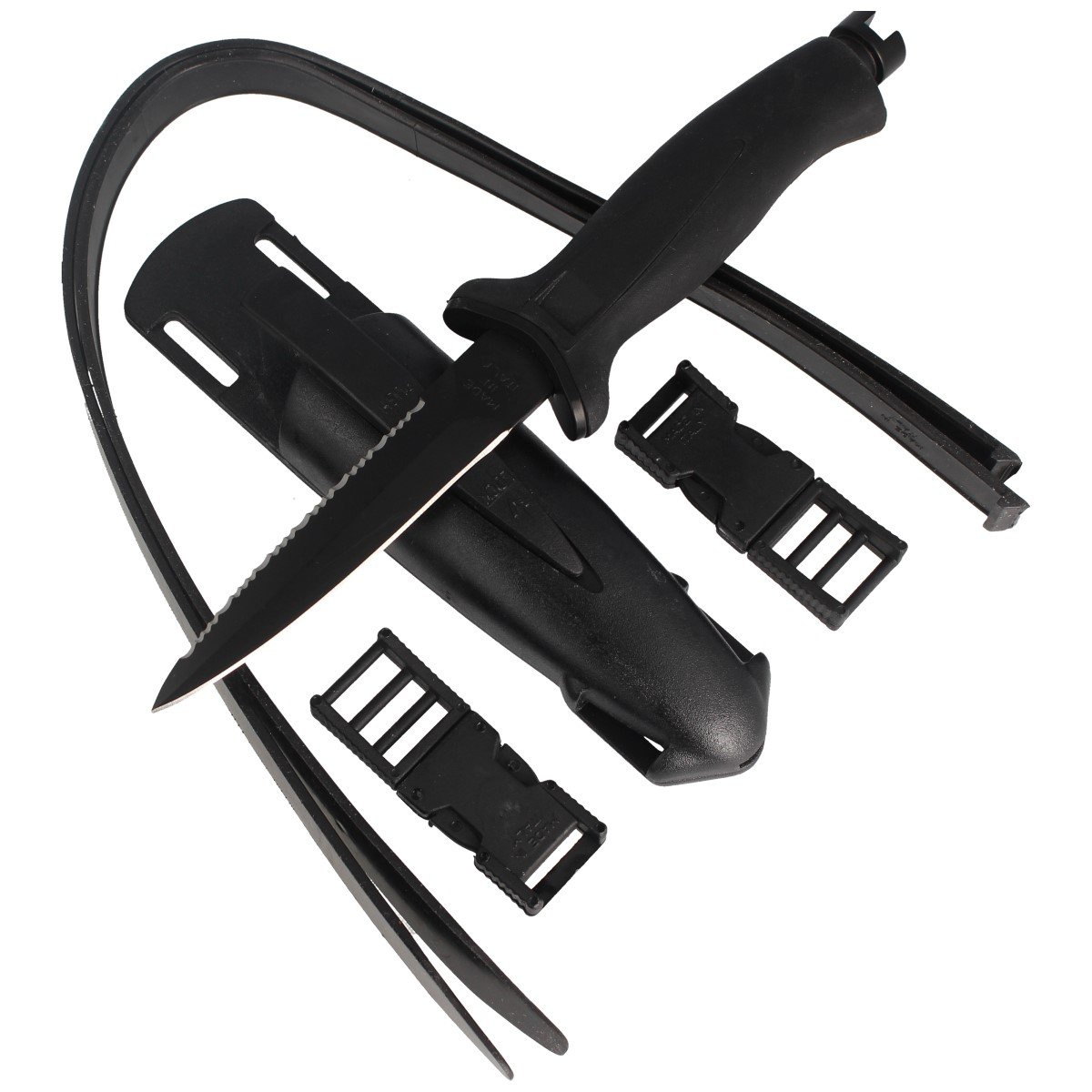 Sheath - made of ABS plastic with holes for drainage of water, moisture. The holster is equipped with a locking latch to prevent the knife from slipping out in water. The sheath comes with two rubber straps and 2 plastic buckles that allow you to attach the case to your arm, leg or to a vest.