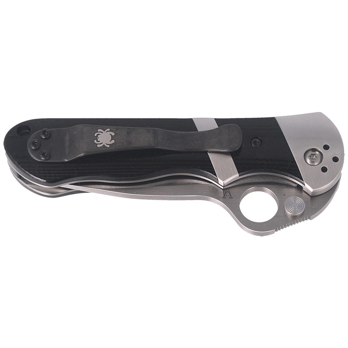 Blade - with the Drop Point profile, 3.5 mm thickness. Smooth blade (Plain type) was made with a concave cut (Hollow Grind) for effective deep cuts. The enlarged 14 mm round SpyderHole notch (Spyderco patent) has increased the thumb support (ramp), which places the thumb directly above the hole allowing quick opening of the knife also in the glove as well as wet, sweaty hands. Pleated thumb ramp on the spine of the blade for efficient operation of the folder. The blade blockade, strong Liner-Lock mechanism.