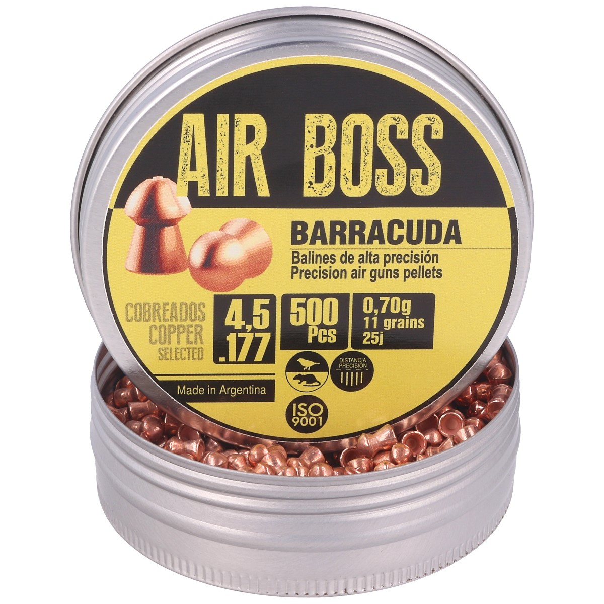 - Air Boss Barracuda Copper .177 / 4,52 mm selected premium pellets with a high ballistic coefficient of BC: 0.032. Polished and hardened with a copper coating to provide 20% higher velocity and accuracy. For sporting events and hunting. 500-pack.