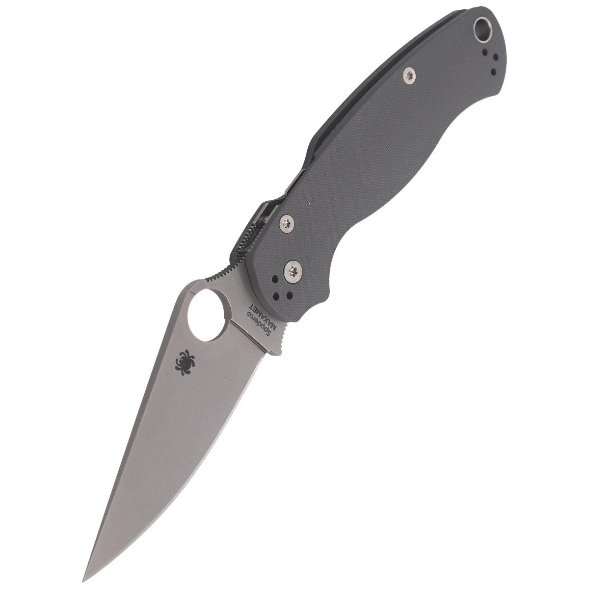 Blade - laser-cut with a modified Clip Point profile, 3.7 mm thick. Glare eliminating Satin Finish (semi-matte) coating. Plain blade is led out with Full Flat Grind to increase cutting properties and reduce the weight of the knife. The enlarged 14mm round SpyderHole cutout (Spyderco patent) allows the knife to be opened even with a glove. Prominent Finger Choil - a contoured undercut for the index finger and a notched thumb ramp on the back of the blade increase control of the knife.