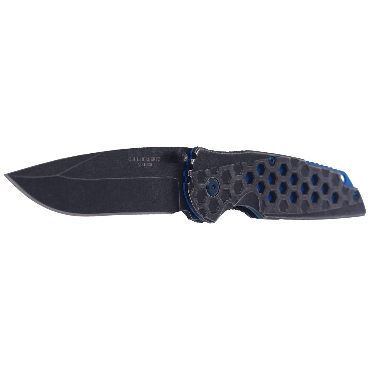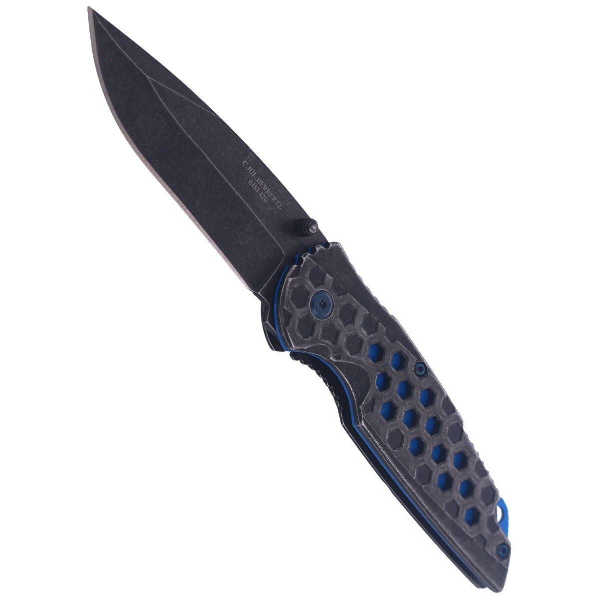 Handle - finished by stonewashed solid stainless steel covers stainless steel. Hexagonal cutouts in the facings create a color contrast allowing you to see the blue liner plates. Open design tzw. open-backed without the usual backspacer, fastened together with steel spacer sleeves for easy cleaning in the field. Spine Jimping notches on the back of the handle increase comfort and grip security. Metal clip (right-wing) allows the knife to be carried in the position tip-down (with the tip of the blade downward). Lanyard hole, elongated cable opening.