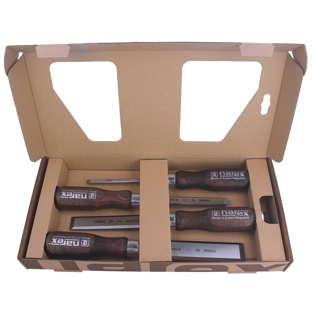 - 863020, 4-piece set of flat chisels with side chamfering from the Narex Profi range. Fully ground and sharpened, innovative chisels with improved blade cross section. Blades forged from high-alloyed Cr-V tool steel