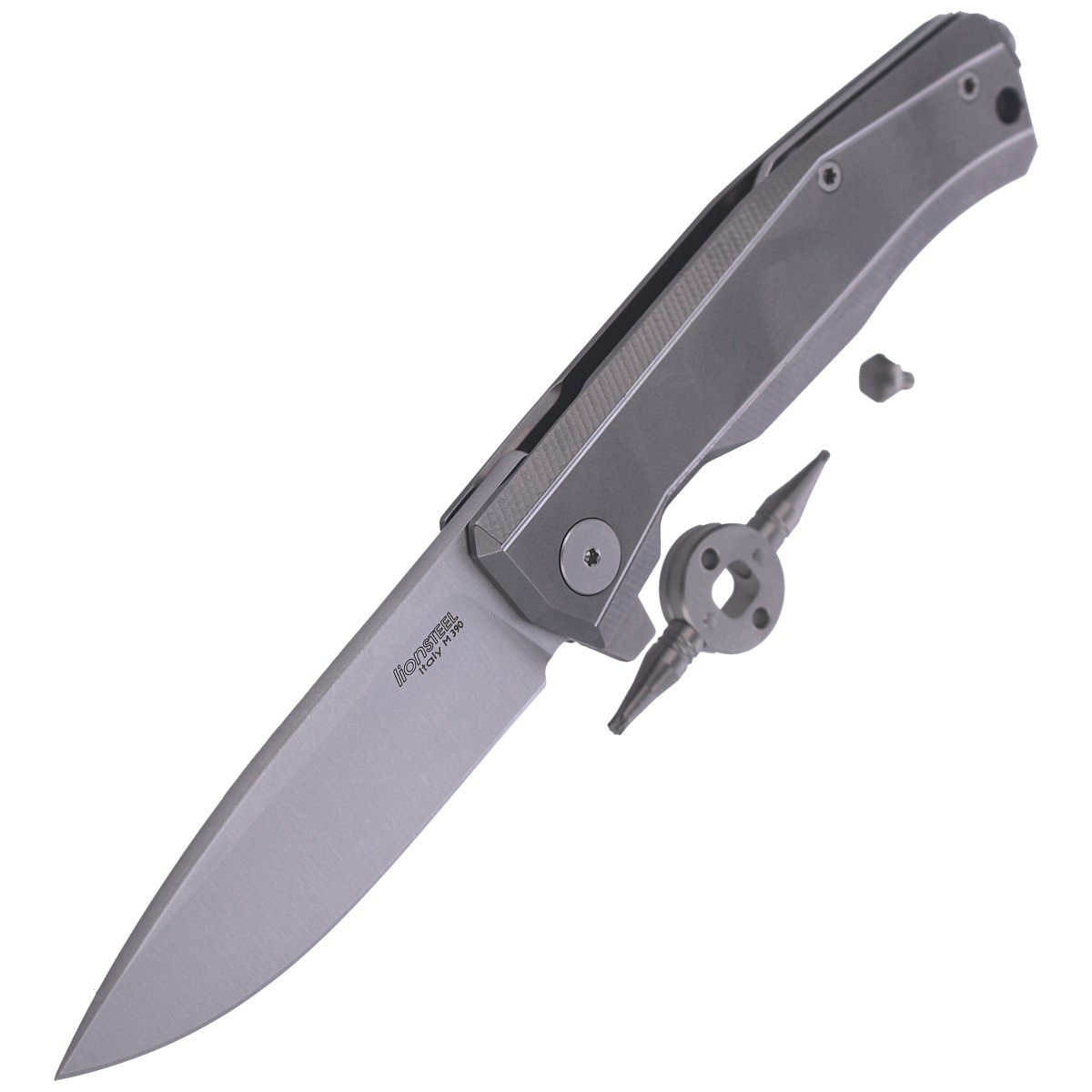 Myto Grey Titanium, Satin a technically advanced Hi-Tech folder with a robust frame-lock. An exceptional E.D.C. knife by the Italian LionSteel manufactory. Equipped with a M390 sintered steel blade, "ReF" fin on the underside of the blade, Double Crown ball bearing system and titanium clip. LionSteel Hand (#HY 68), Torx T6, Torx 8 adjustment spanner along with a Hex spanner for the glass striker screw are included.