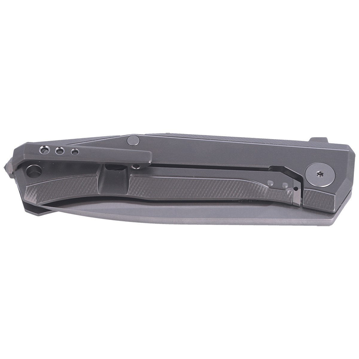 Handle - Grey coloured facings of double milled solid titanium 6AI-4V, attached to a titanium spacer called backspacer / facings connector. The titanium Solid® clip allows the knife to be carried in tip-up position. The clip is bolted to the titanium frame with a tungsten carbide screw/glass striker. In the back of the linings lanyard hole, a hole for a cord.