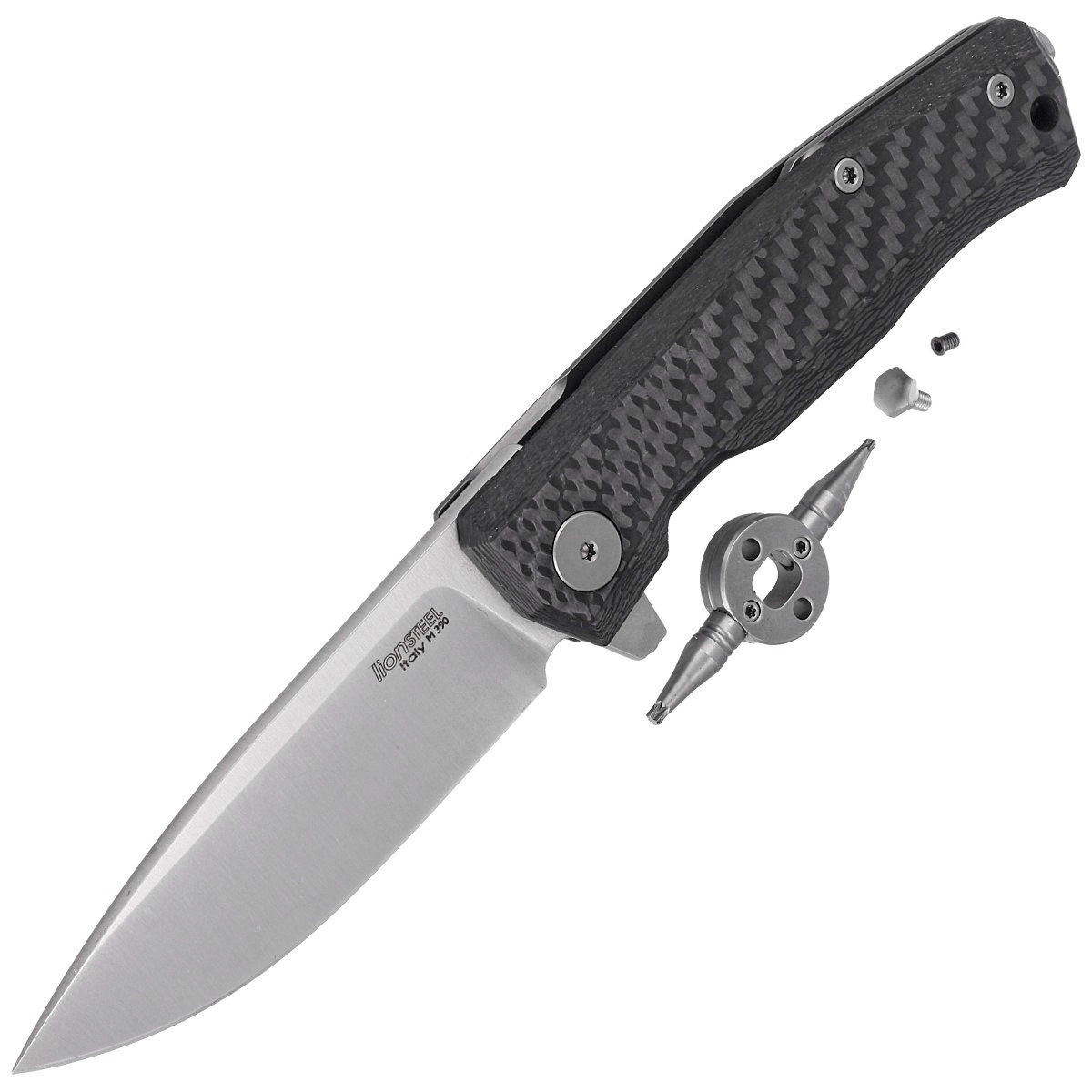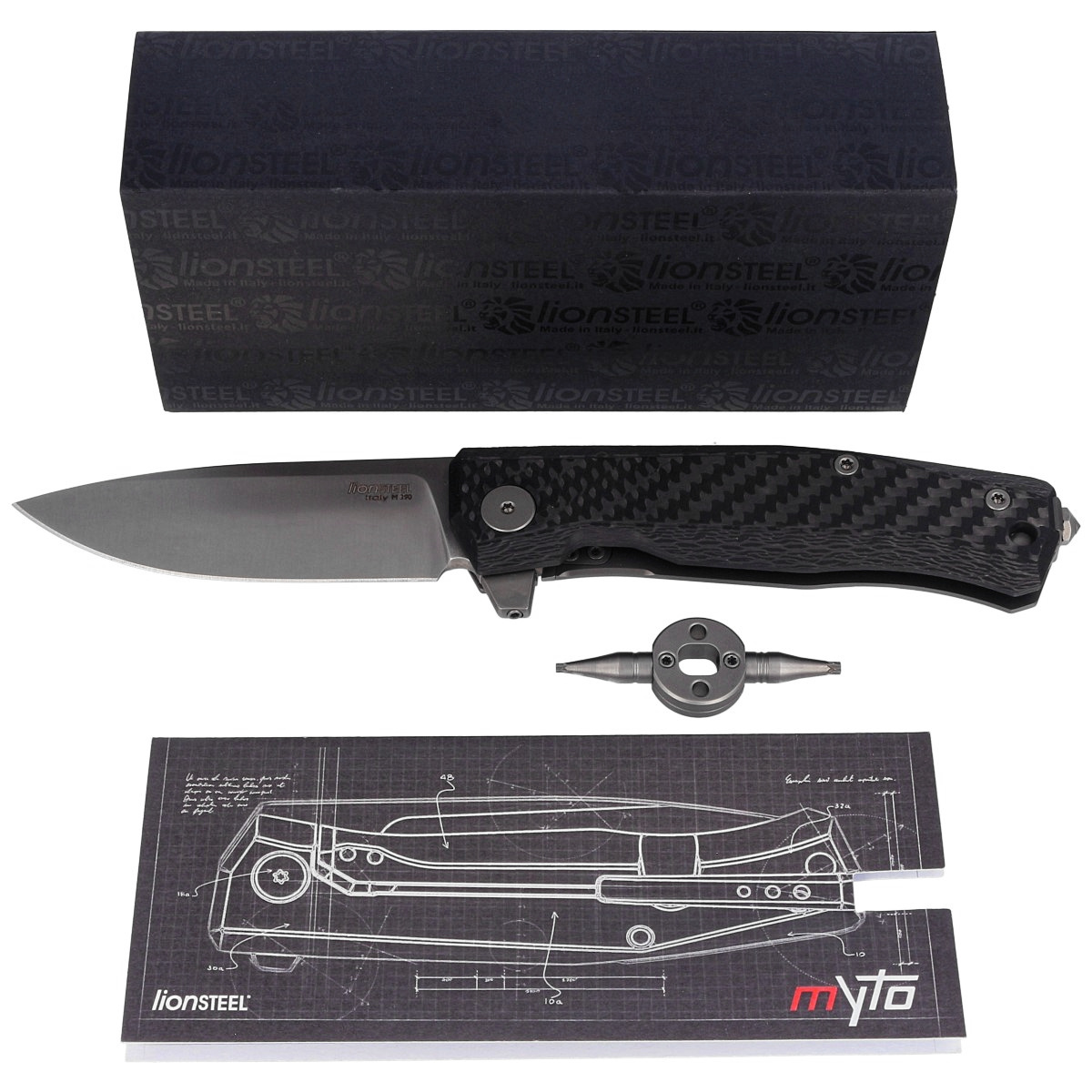 Myto Carbon Fiber, Satin a high-tech Hi-Tech folder with a durable frame-lock. An exceptional E.D.C. knife by the Italian LionSteel manufactory. Features M390 sintered steel blade, "ReF" on the underside of the blade, Double Crown ball bearing system and titanium clip. Comes with LionSteel Hand (#HY 68), Torx T6, Torx 8 adjustment wrench along with Hex wrench for glass breaker screw.