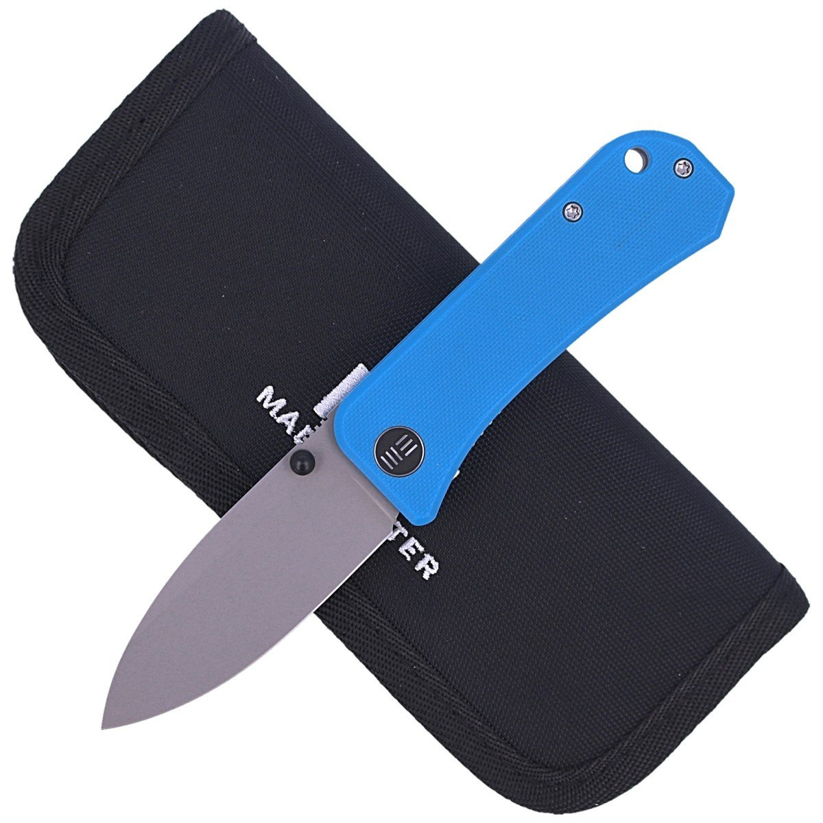 Handle - milled blue G10 plastic pieces. Open-backed construction fastened together with steel spacer sleeves reduces weight and facilitates cleaning. The pivot is decorated with stylized WE brand logo. Right-side, one-position metal deep carry clip allows you to carry the knife discreetly in your pocket in tip-up position. Lanyard hole on back of handle for cord.