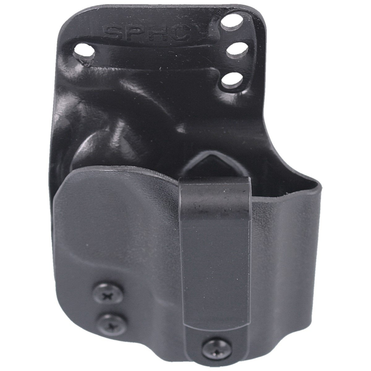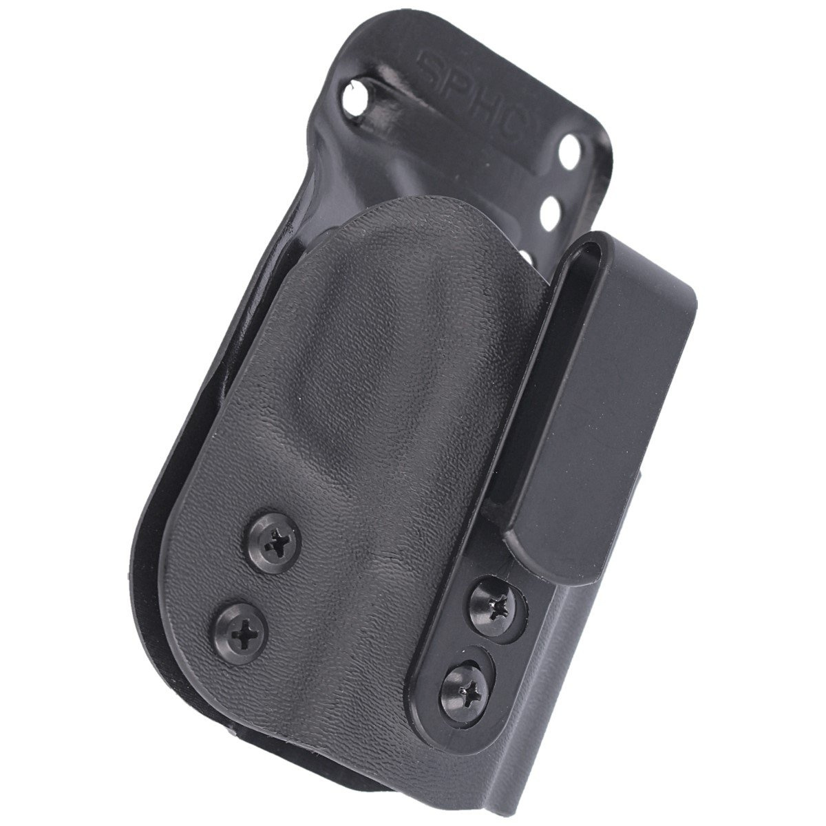 SPHC holster from the FIT SPECIFICS series - Designed for versatile use as either an external OWB (Outside the Waist Band) or internal IWB (Inside the Waist Band), depending on the user's needs. Engineered for concealed carry (IWB), it attaches to the belt from the inside of the trousers. Features an adjustable retention screw near the trigger guard, allowing for personalized grip strength. Right-handed model.