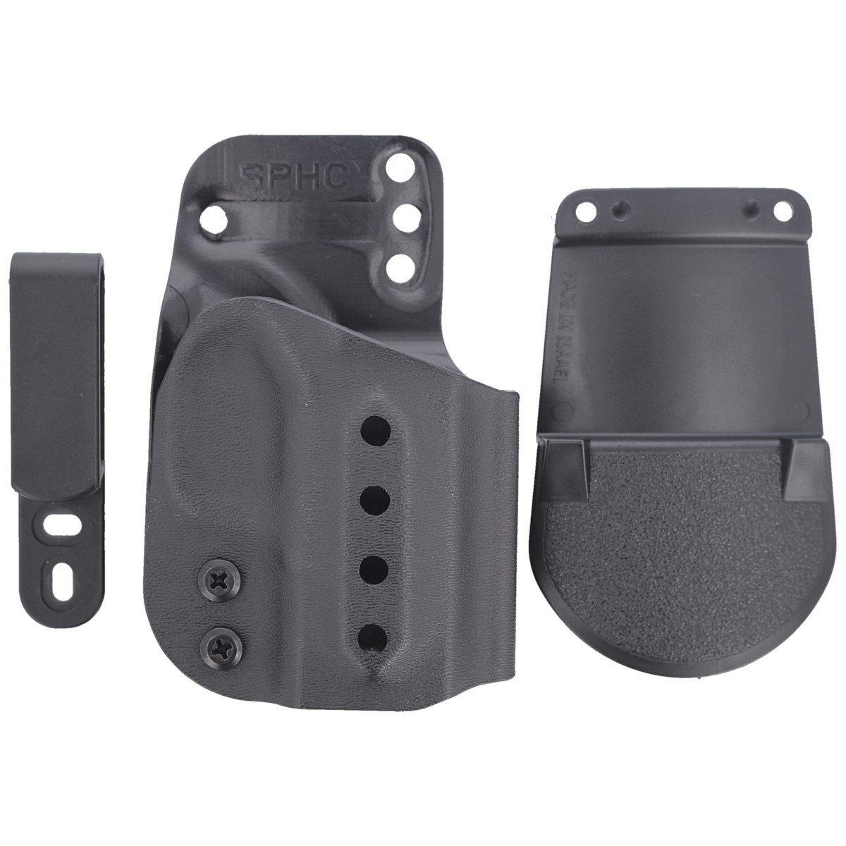 - SPHC holster OWB (Outside the Waist Band) or holster IWB (Inside the Waist Band) as needed. For concealed carry (IWB) attached from the inside of pants to the belt. An adjustable retention screw for customizing holster tension. For Springfield Hellcat 9mm