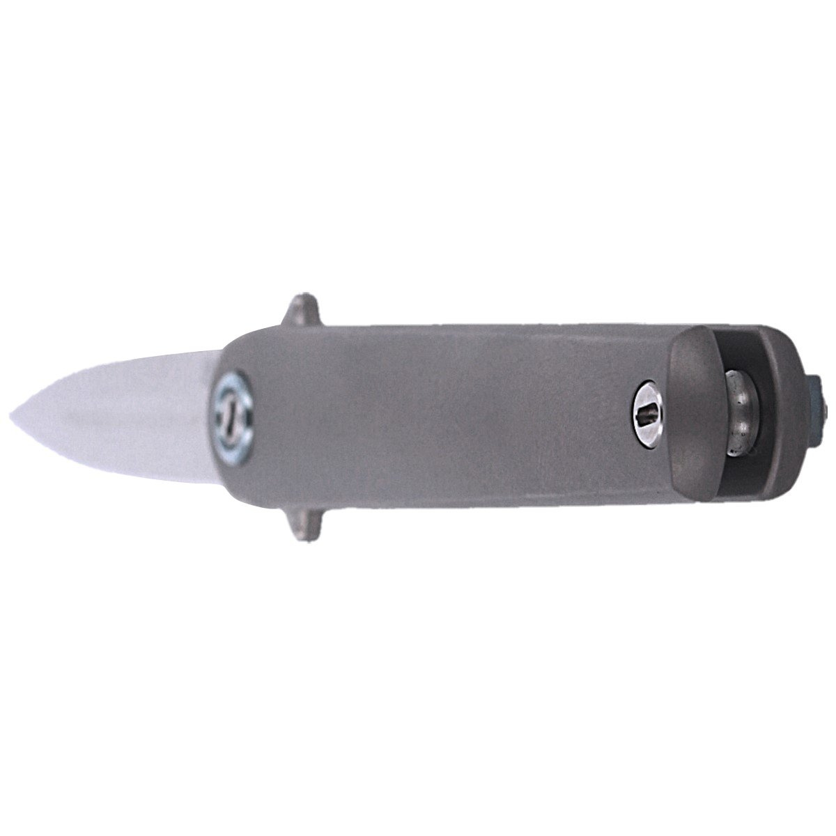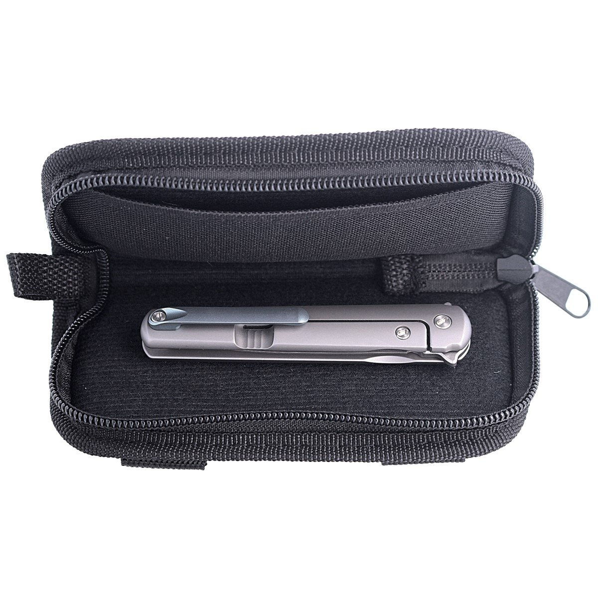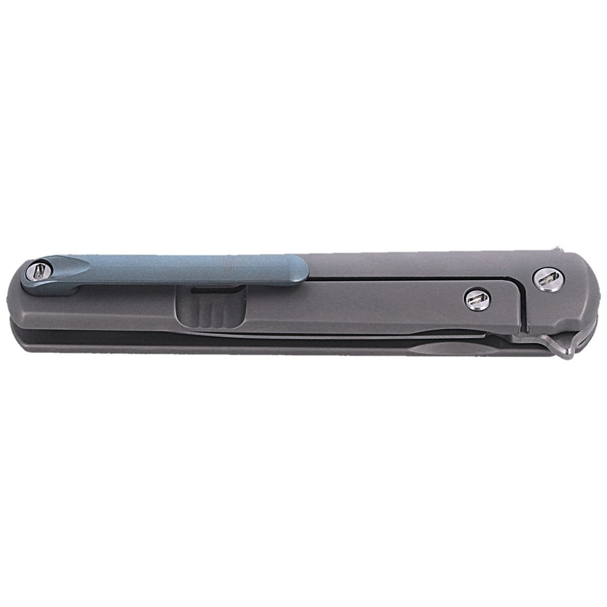 Handle - Ti6AI4V titanium grips offer high structural rigidity and resistance to wear in everyday use. The sandblasted surface provides a subtle matte aesthetic and grip without the need for additional textures. The spacer-bonded body features simplicity and elegance, while maintaining full mechanical resistance. The deep carry clip, also titanium, allows the folder to be carried discreetly without protrusions. It comes with a Cordura case with zipper and belt attachment - a refined accessory for discerning users.