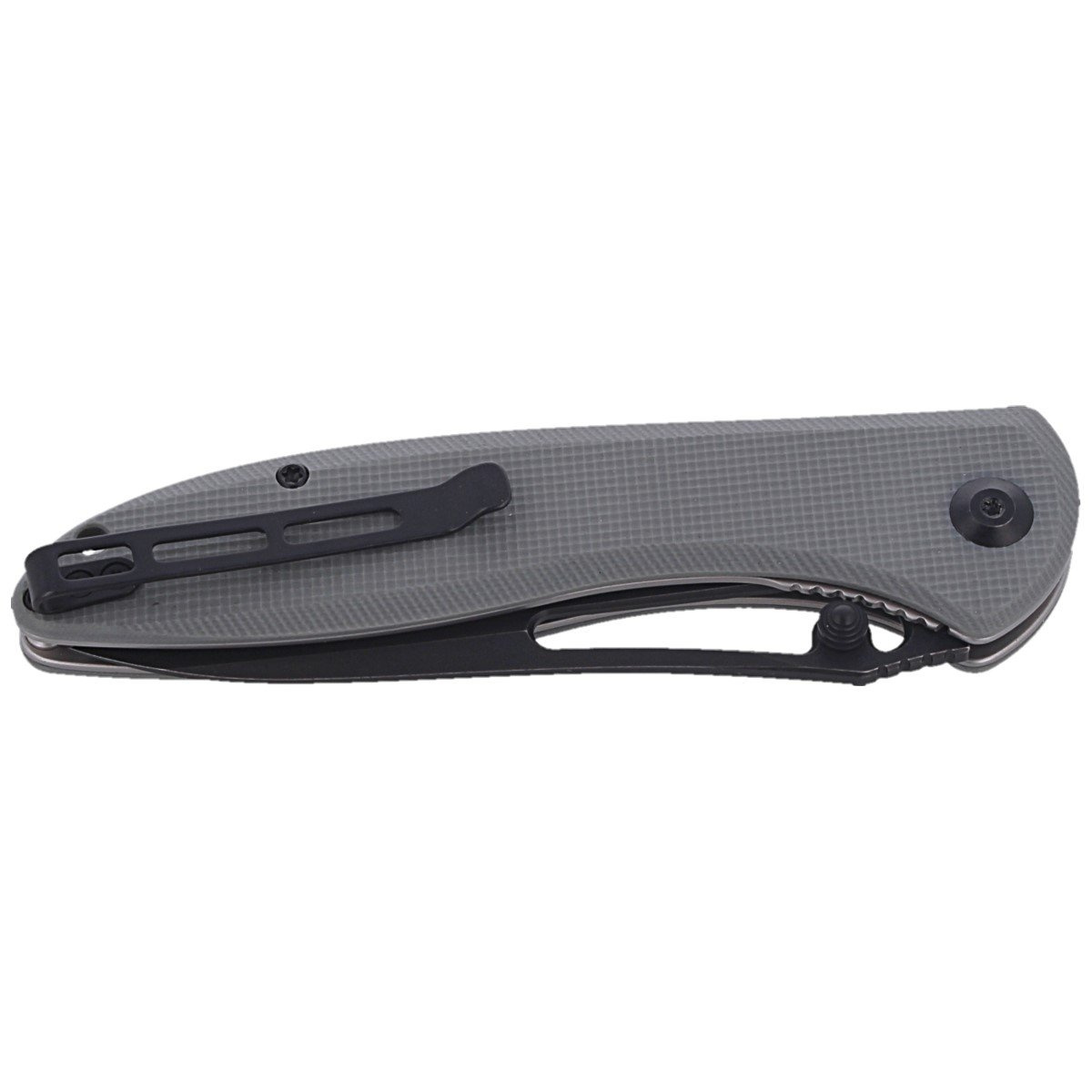 The handle is made of gray G10, which was screwed to the steel frame of the knife. To improve grip, they are deeply textured. Sheaths were screwed together using steel spacers, thus reducing the weight of the knife. Simplicity and solidity of construction give assurance of many years of use. Two-position (right/left) steel deep carry clip allows you to carry the knife in tip-up position. In the back of the handle, above the clip, there is a lanyard hole for attaching a safety or decorative cord. As in other models, the pivot is decorated with stylized manufacturer's logo.