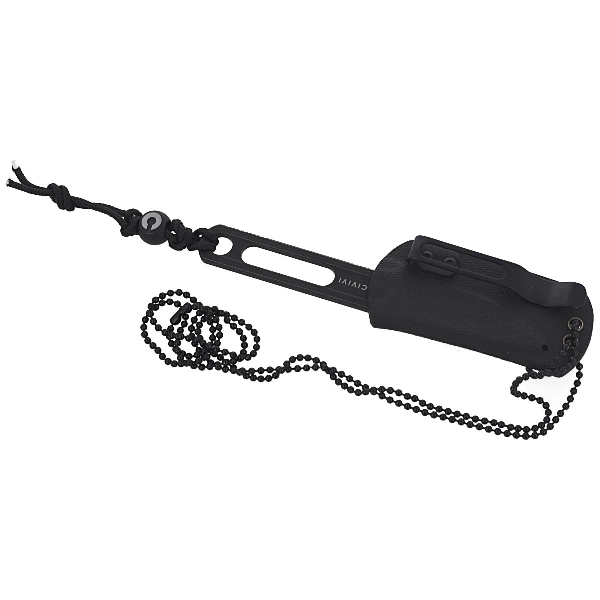 Handle - tang of the knife with holes allowing to braid e.g. paracord around it. In the lower part we find two notched (jimping) fragments improving grip. Simple, solid construction guarantees many years of use. The set includes black kydex sheath which can be attached to a belt or pocket. You can also wear the knife around your neck by the included chain. In set we get an impressive pendant with titanium bead decorated with company logo.
