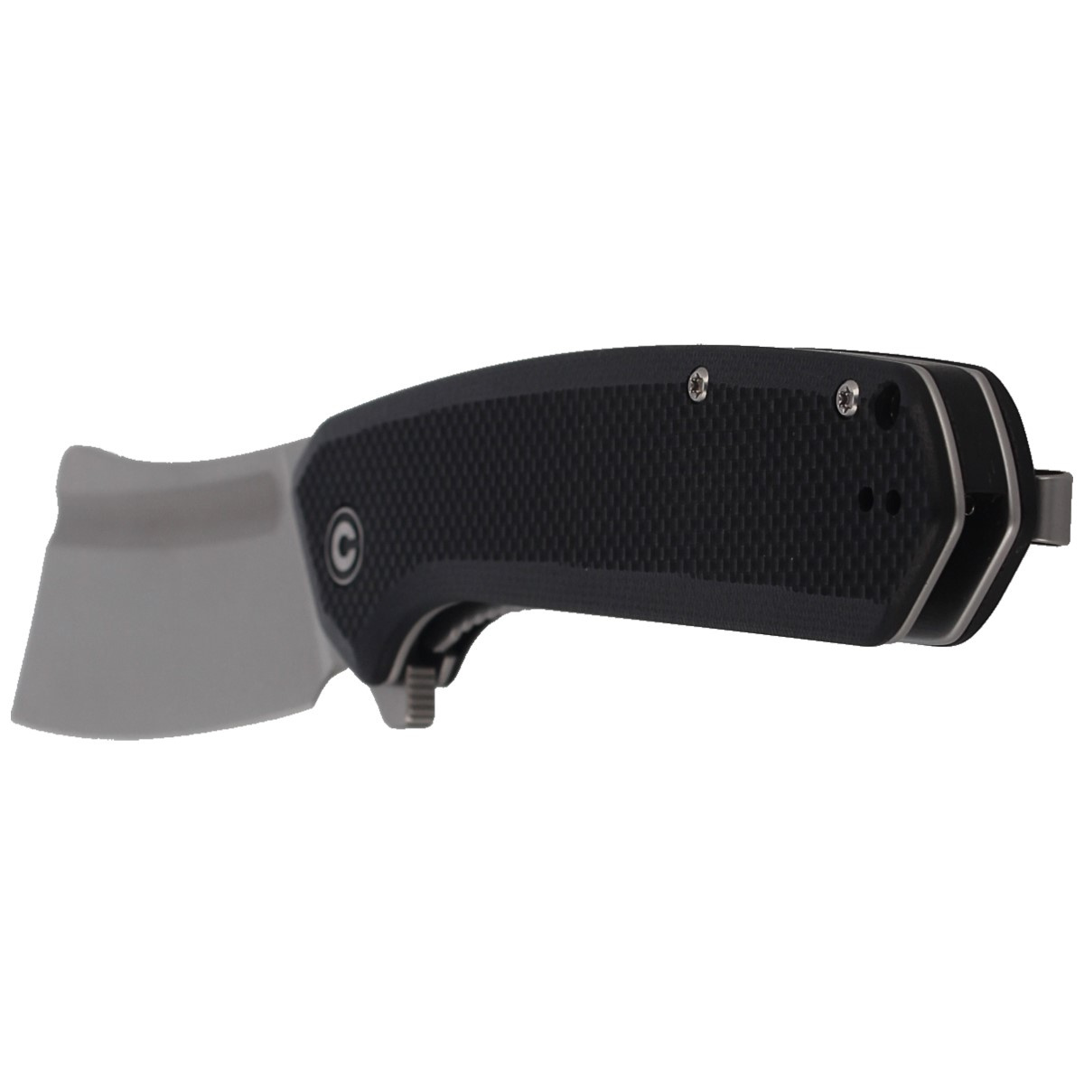 Handle - a layer of solid G10, with a very rough texture. The whole is mounted to steel liners, which in practice means many years of use. Backspacer made of black G10. Pivot axis is decorated with stylized Civivi brand logo. Two-position left/right metal deep carry clip allows you to carry the knife discreetly in your pocket in tip-up position. Above the clip is a lanyard hole for fishing line.