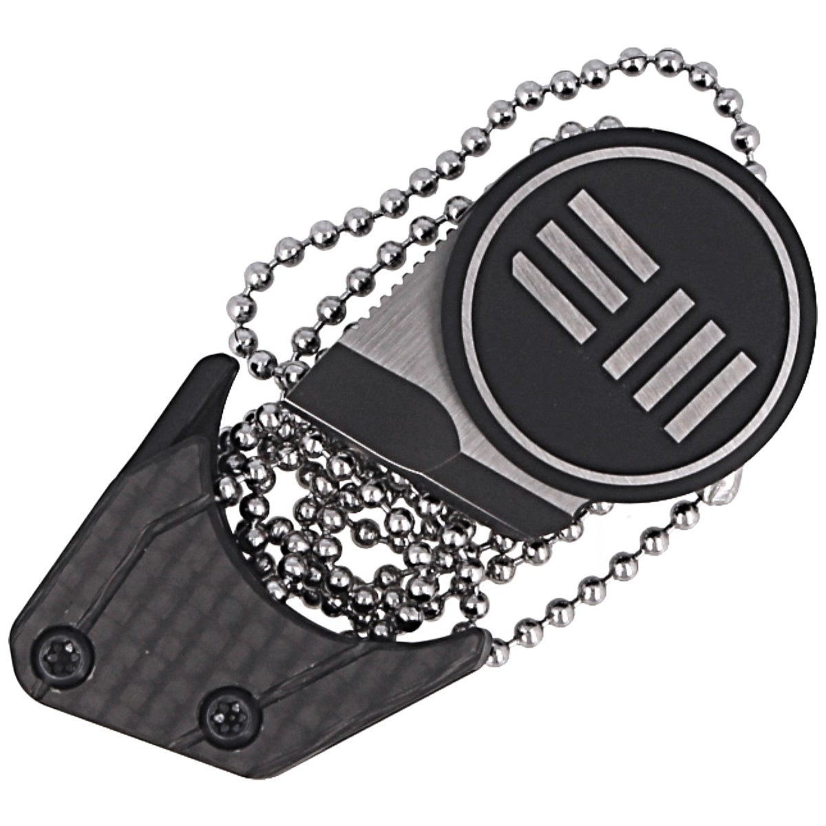 Handle - made of titanium, allows comfortable grip with two fingers (pinch grip). Decorated with silvery WE Knife logo. The sheath is also made of titanium and allows you to wear the knife as a neck knife by using the attached chain. A small magnet hidden inside the sheath prevents the blade from falling out while carrying.
