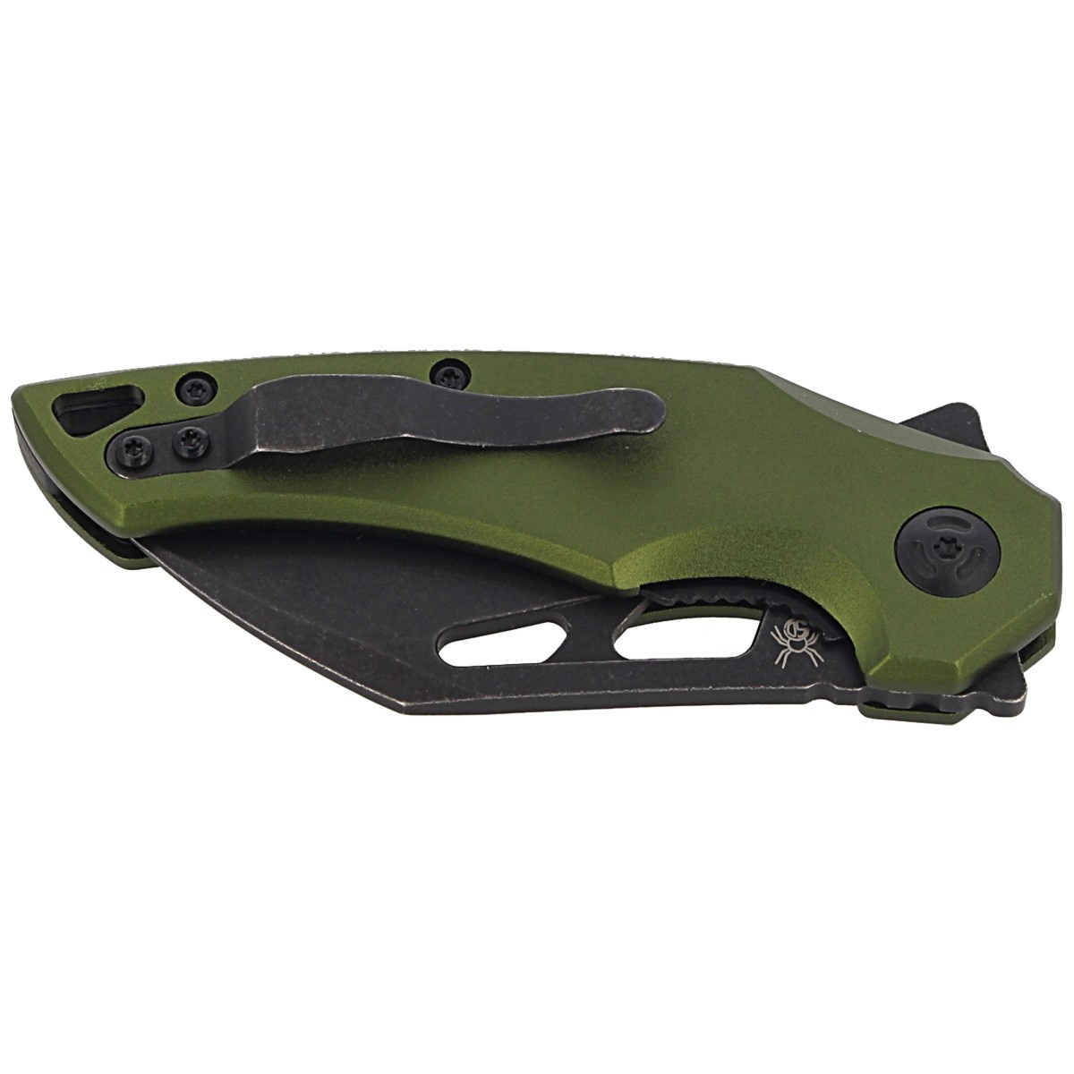 Handle - profiled, made of green anodized aluminum. Facings are attached to a solid spacer (backspacer / handle facings connector) made of G10 plastic, which provides strength of construction. Robust, double-sided cut-out in the handle guarantees intuitive right/left hand access to the opening as well as to the head lock release. Metal clip (right side) allows you to carry the knife in tip-up position. The lanyard hole in the back of the handle is for attaching a lanyard or safety line.