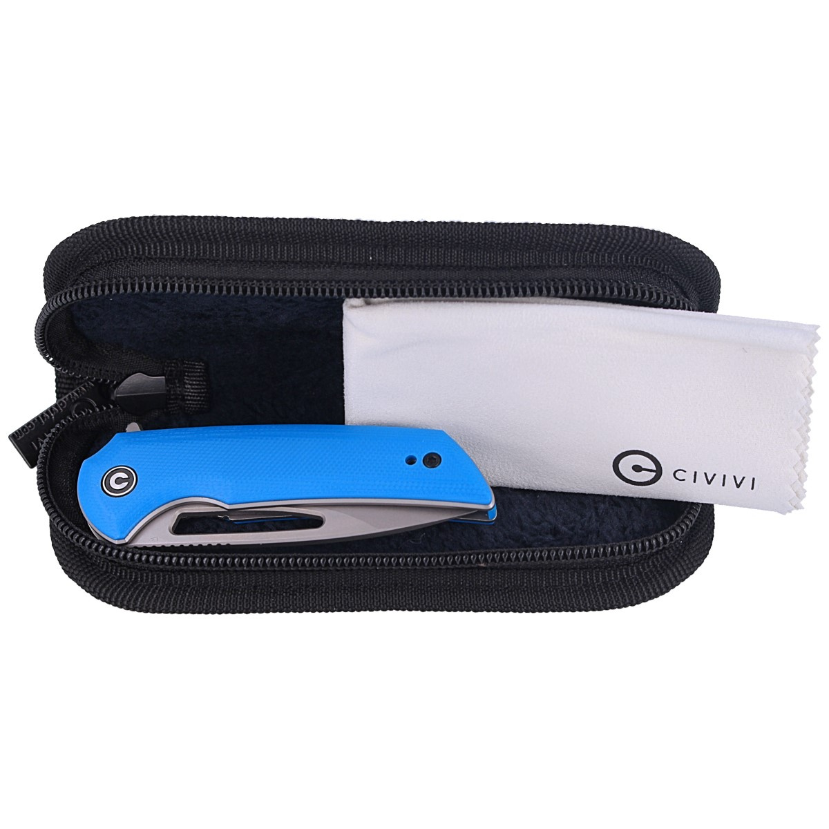 Handle - chamfered blue G10 plastic liners, attached to stainless steel liners. Surface with tactile texture for improved grip. Simple, solid construction gives assurance of many years of use. Blue backspacer made of the same material as covers. The pivot is decorated with a stylized Civivi brand logo. Two-position metal left/right deep carry clip allows you to carry the knife discreetly in your pocket in tip-up position.