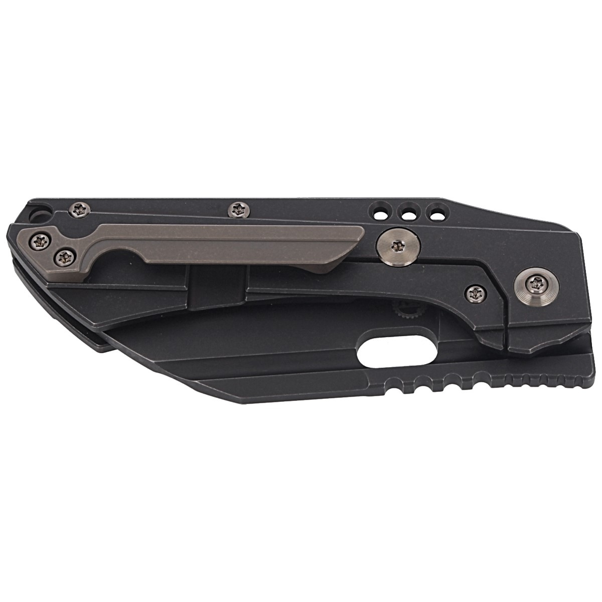 Handle - thick pieces of titanium, connected to each other by a titanium backspacer. The simplicity and solidity of the construction ensure many years of use. One-position clip (right), made of titanium, allows you to carry the knife in tip-up position. In the back of the backspacer there is a hole for threading a safety or decorative cord. As in other models, the pivot is decorated with a stylized logo of the manufacturer.