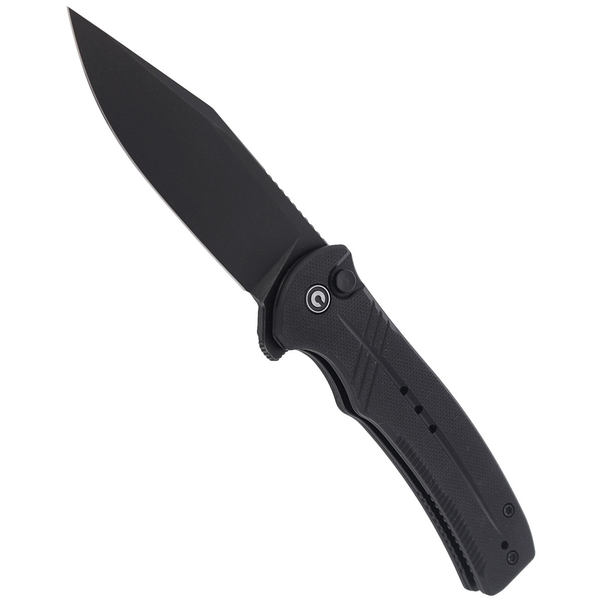 Handle - made of G10 plastic (fiberglass compressed under pressure with resin) in black. Chamfered cover edges eliminate sharp edges for comfort and sure grip. Open-backed design attached with steel spacer sleeves reduces weight and makes cleaning easier. The pivot is decorated with a stylized Civivi brand logo. Two-position (right/left) metal deep carry clip allows you to carry the knife discreetly in your pocket in tip-up position. To improve grip, jimping has also been done on the liners front and back.