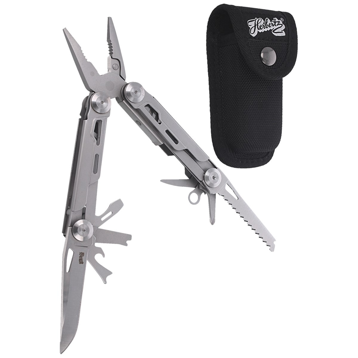 - Multitool of the German brand Herbertz Solingen made of satin stainless steel. Includes: pliers, wire cutter, blade, saw, bottle opener, flat and Phillips screwdrivers, file, can opener, wire stripper, awl, key ring