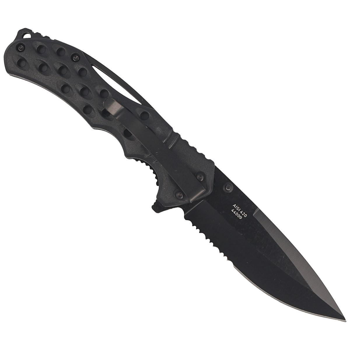 Blade - Drop Point type covered with black protective coating. Small thickness of the blade in combination with high, concave grind gives the perfect geometry of the cutting edge and extreme cutting performance. Pads support the smooth operation of the blade's opening mechanism, which can be opened with a pin (Thumb Stud) or a quick index-finger flipper. The whole is locked with a solid liner lock.