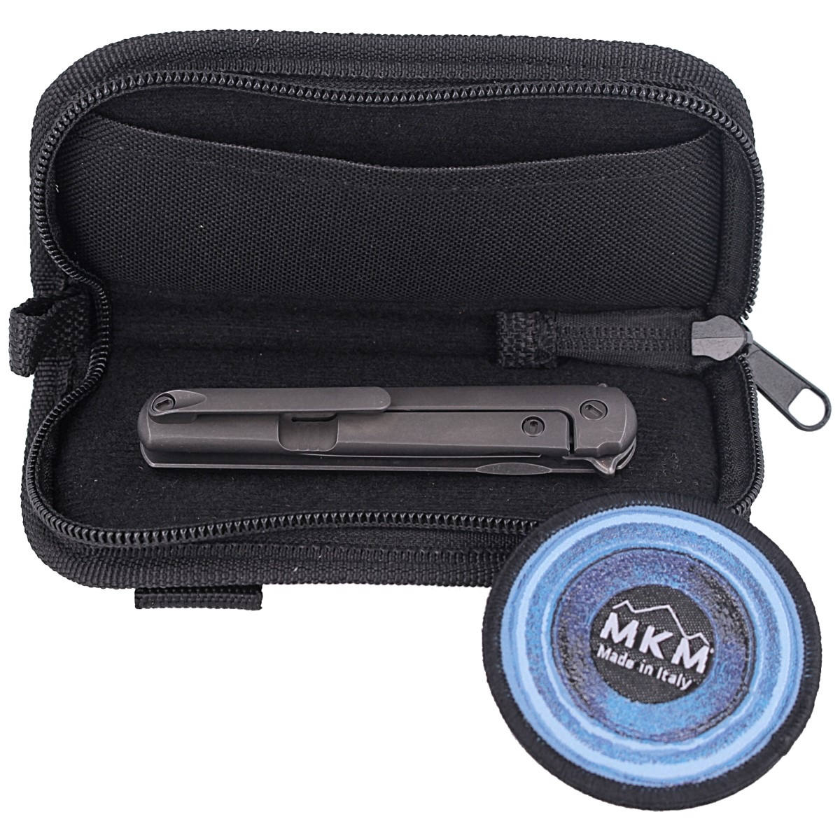 Handle - Ti6AI4V titanium grips offer high structural rigidity and wear resistance in everyday use. The black-coated surface provides a subtle matte aesthetic and grip without the need for additional textures. The spacer-jointed body features simplicity and elegance, while maintaining full mechanical resistance. The deep carry clip, also titanium, allows the folder to be carried discreetly with no protrusions. A Cordura case with zipper and belt attachment is included - a refined accessory for discerning users.