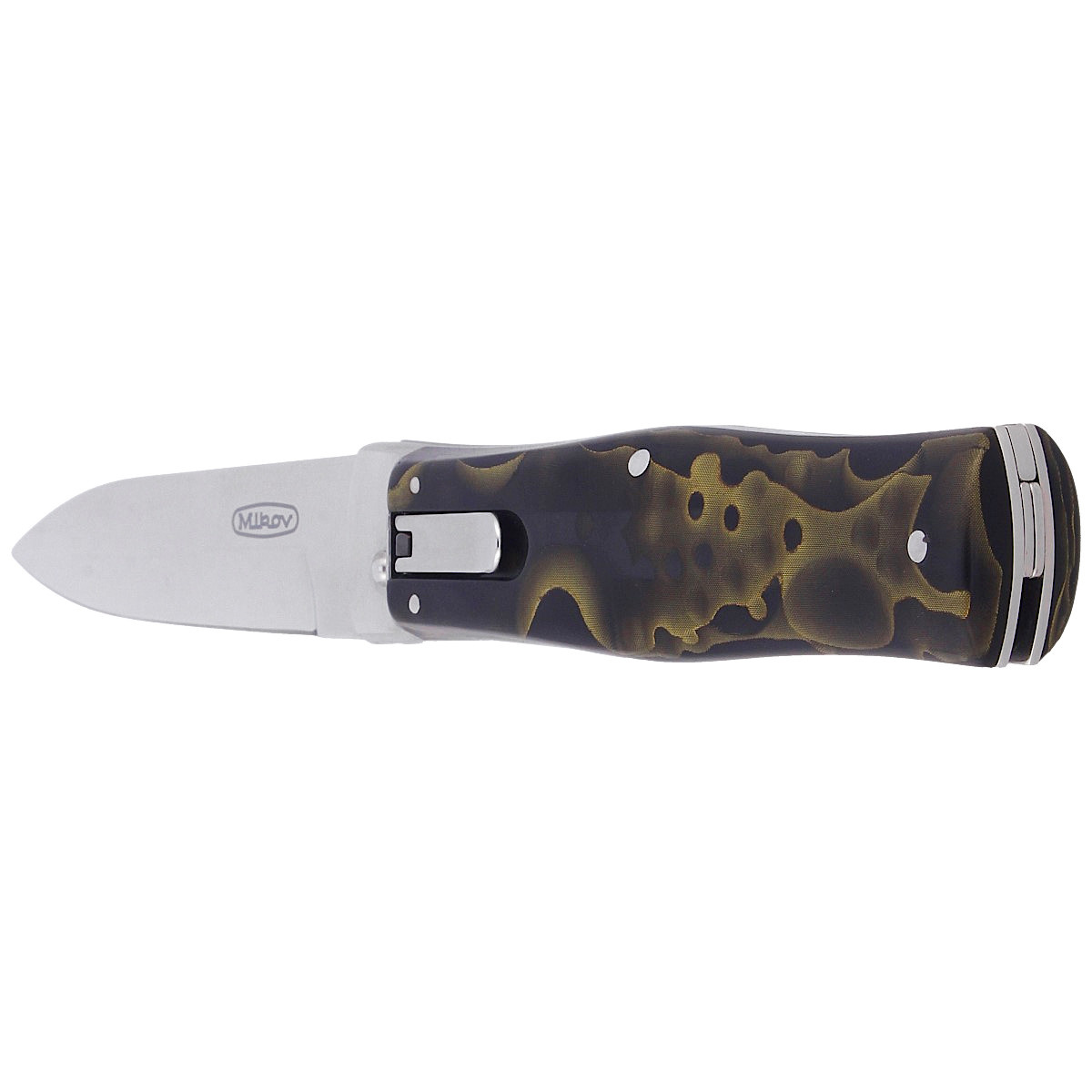 Predator Raffir Green, Mirror a swichblade automatic knife from Mikov of Mikulasovice, Czech Republic, with a N690 steel blade and facings made of phenomenal Raffir composite material with an amazing 3D pattern. This region has specialized in the production of knife products since 1794, being called the "Czech Solingen".