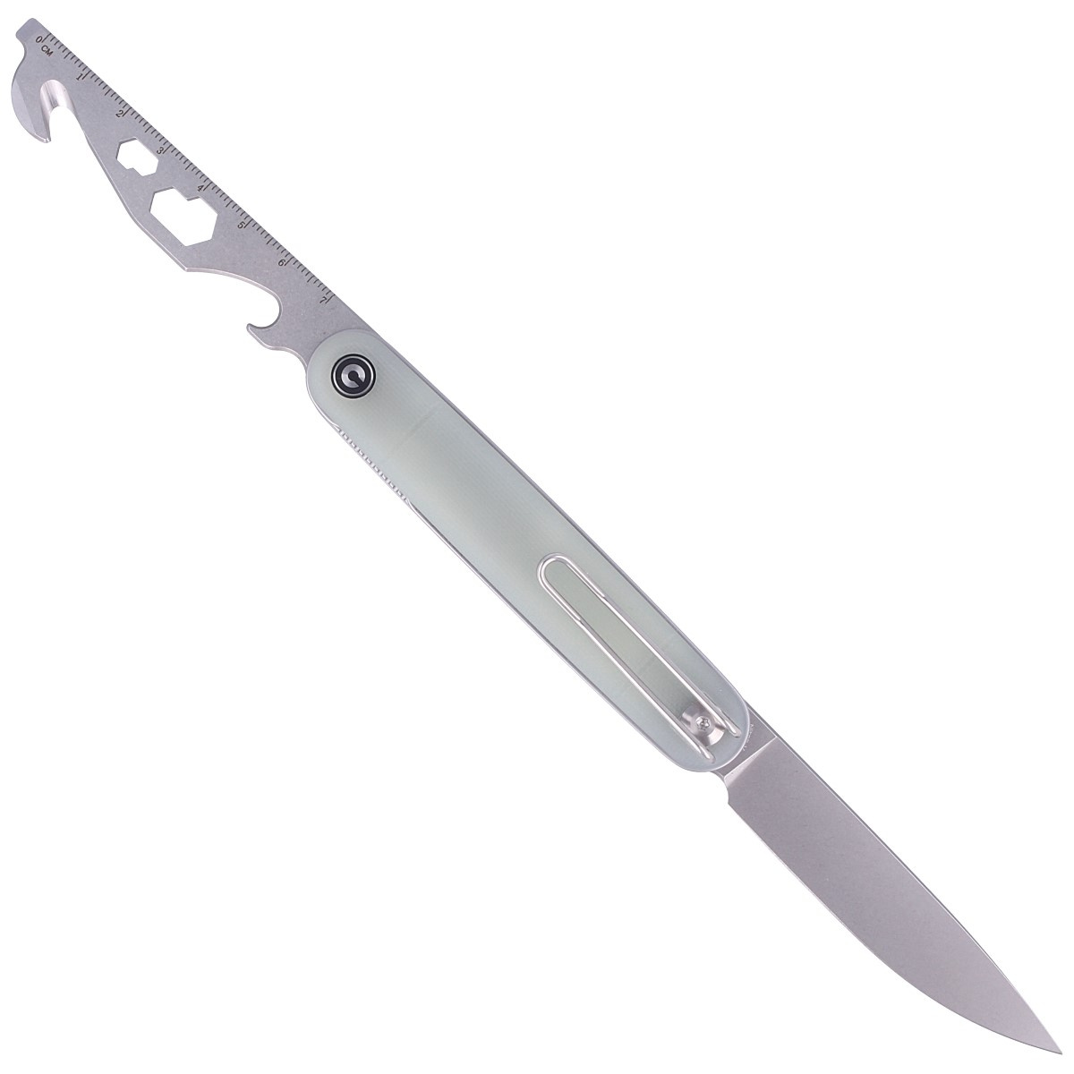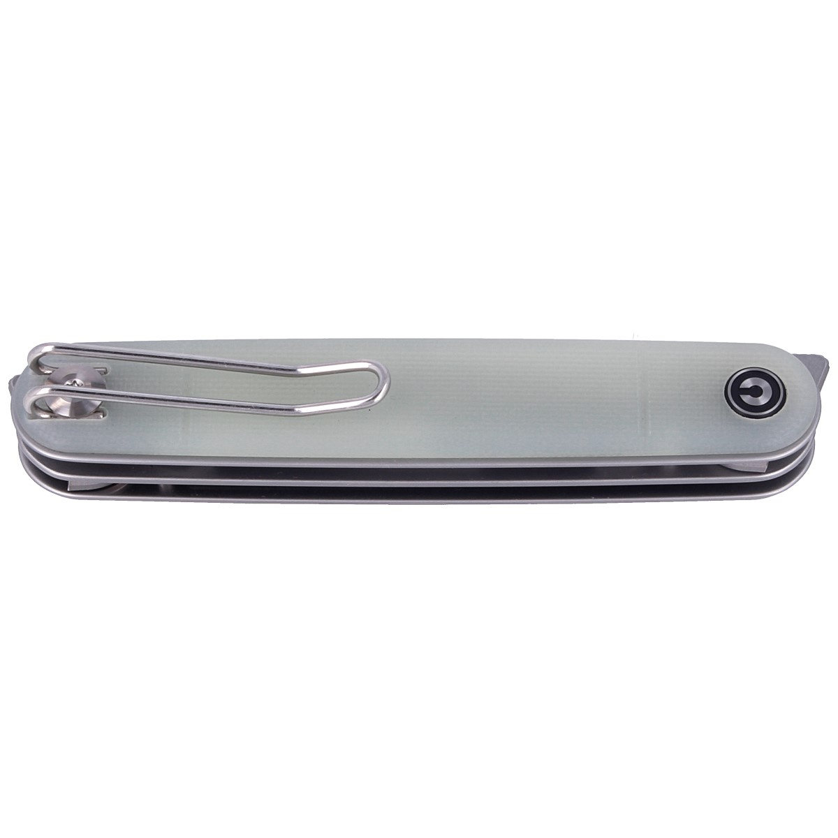 Handle - chamfered Natural G10 (fiberglass pressed with synthetic resin) facings, attached to stainless steel liners. Surface of the liners with perceptible texture improving grip security. Simple, solid construction provides assurance of long-term use. Open-backed design attached by steel spacer sleeves reduces weight and makes cleaning easier. The pivot is decorated with a stylized Civivi brand logo. Four-position metal wire clip left/right deep carry allows you to carry the knife discreetly in your pocket in tip-up or tip-down position.