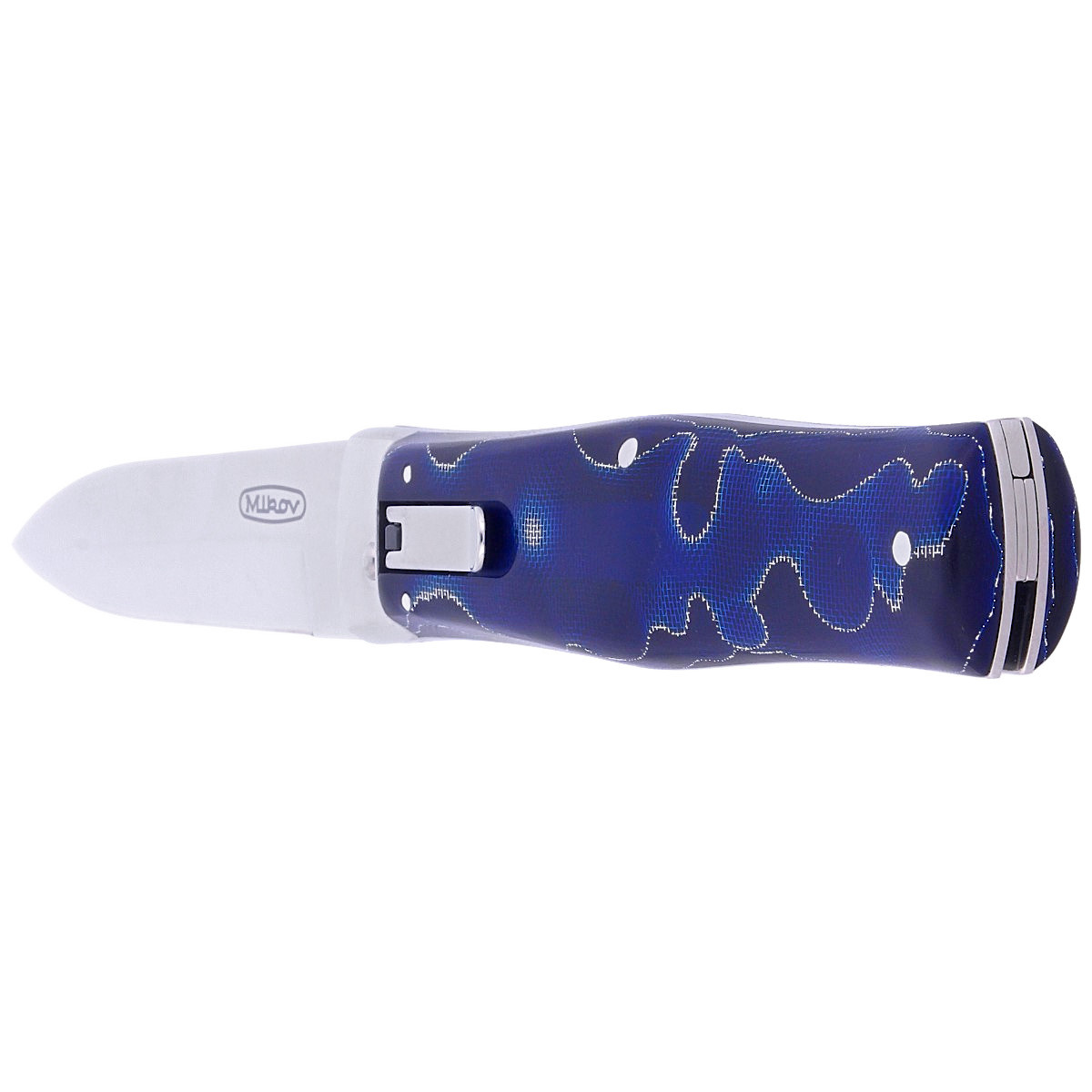 Predator Raffir Blue, Mirror a swichblade automatic knife from Mikov of Mikulasovice, Czech Republic, with a N690 steel blade and facings made of phenomenal Raffir composite material with an amazing 3D pattern. This region has specialized in the production of knife products since 1794, being called the "Czech Solingen".