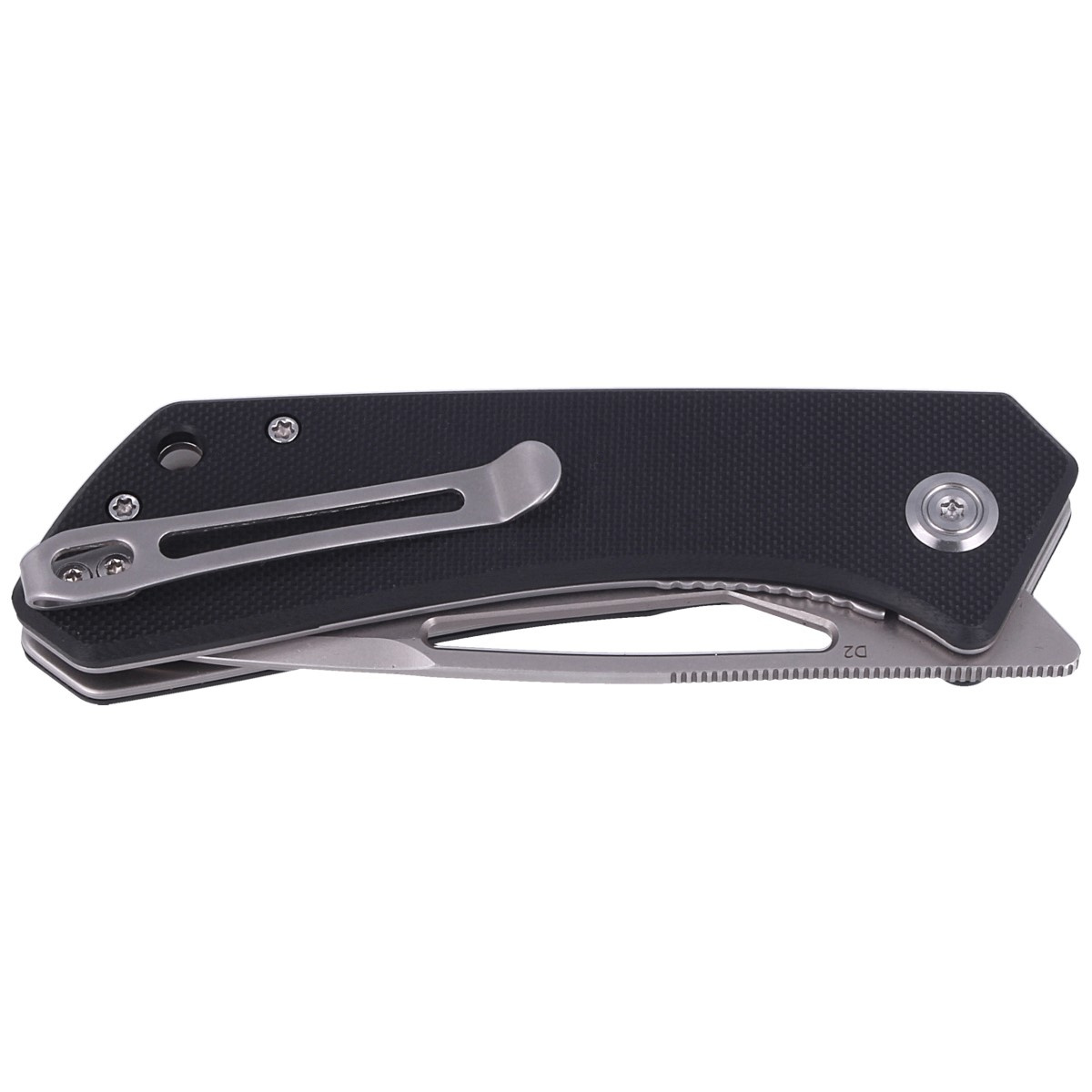 Thalia Black G10, Beadblasted is a versatile folder designed for everyday use. Drop point blade made of excellent D2 tool steel, long-lasting sharpness and damage. The Front Flipper opening mechanism and the hole in the clod allow for quick, smooth unfolding of the blade with one hand. The handle made of durable G10 composite offers excellent grip in all conditions. The ergonomic design ensures a secure grip. Sturdy construction, high-precision manufacturing and reliability in daily use.