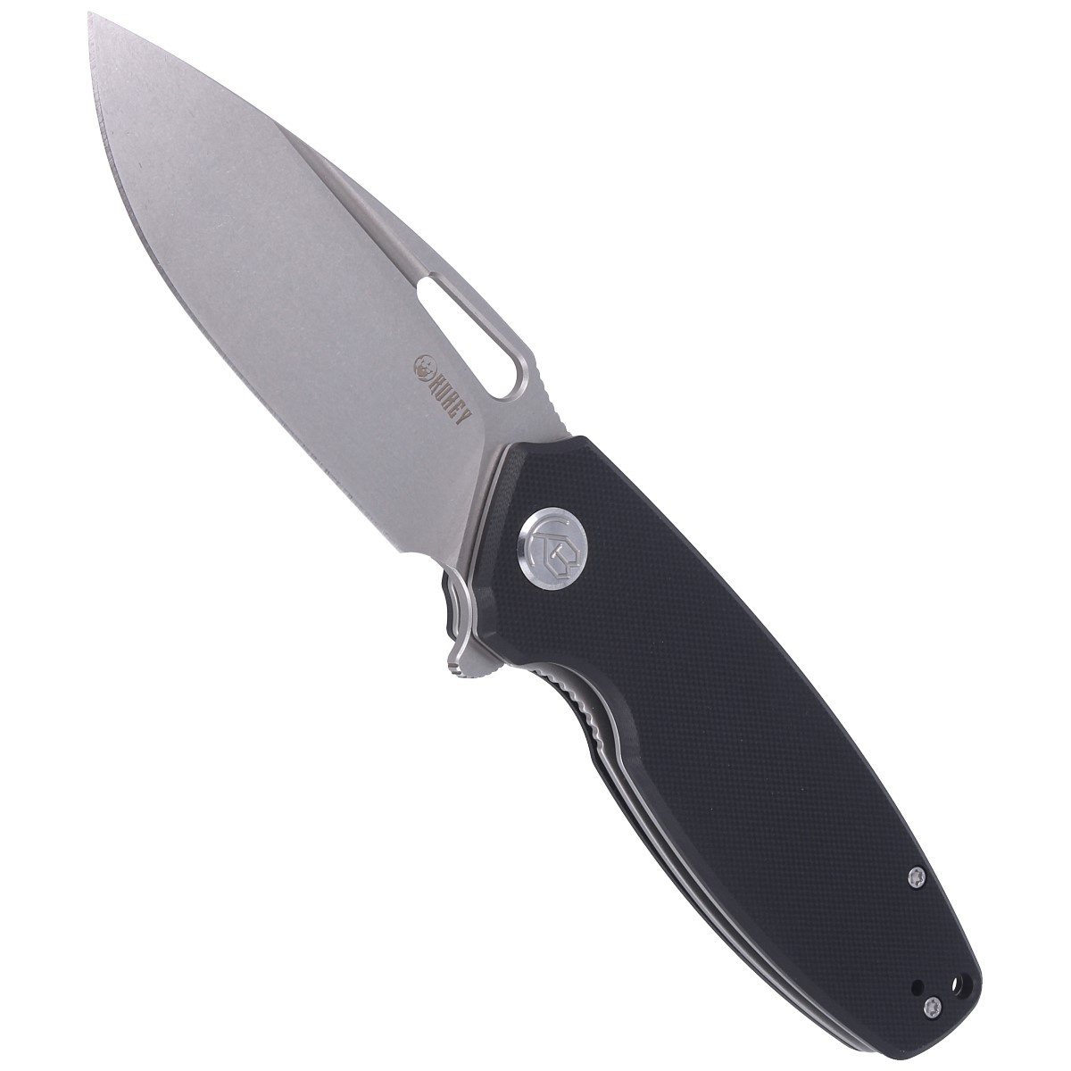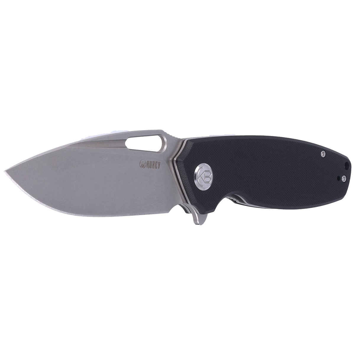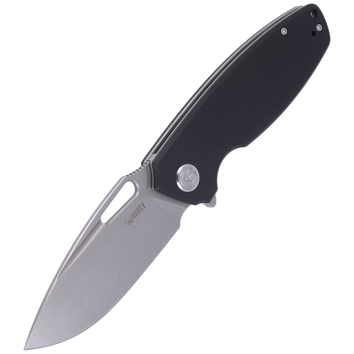 Black G10 (fiberglass compressed with synthetic resin) textured handle grips screwed to steel frame for better grip. The open-backed design secured together by steel spacers reduces weight and makes cleaning easier. Simple, sturdy design gives assurance of many years of use. Deep forefinger groove improves grip security. The pivot is embellished with a stylized Kubey Knife brand logo. Two-position (right/left) metal deep carry clip allows you to carry the knife discreetly in your pocket in tip-up position. Above the clip lanyard hole, a hole for threading a safety or decorative cord.