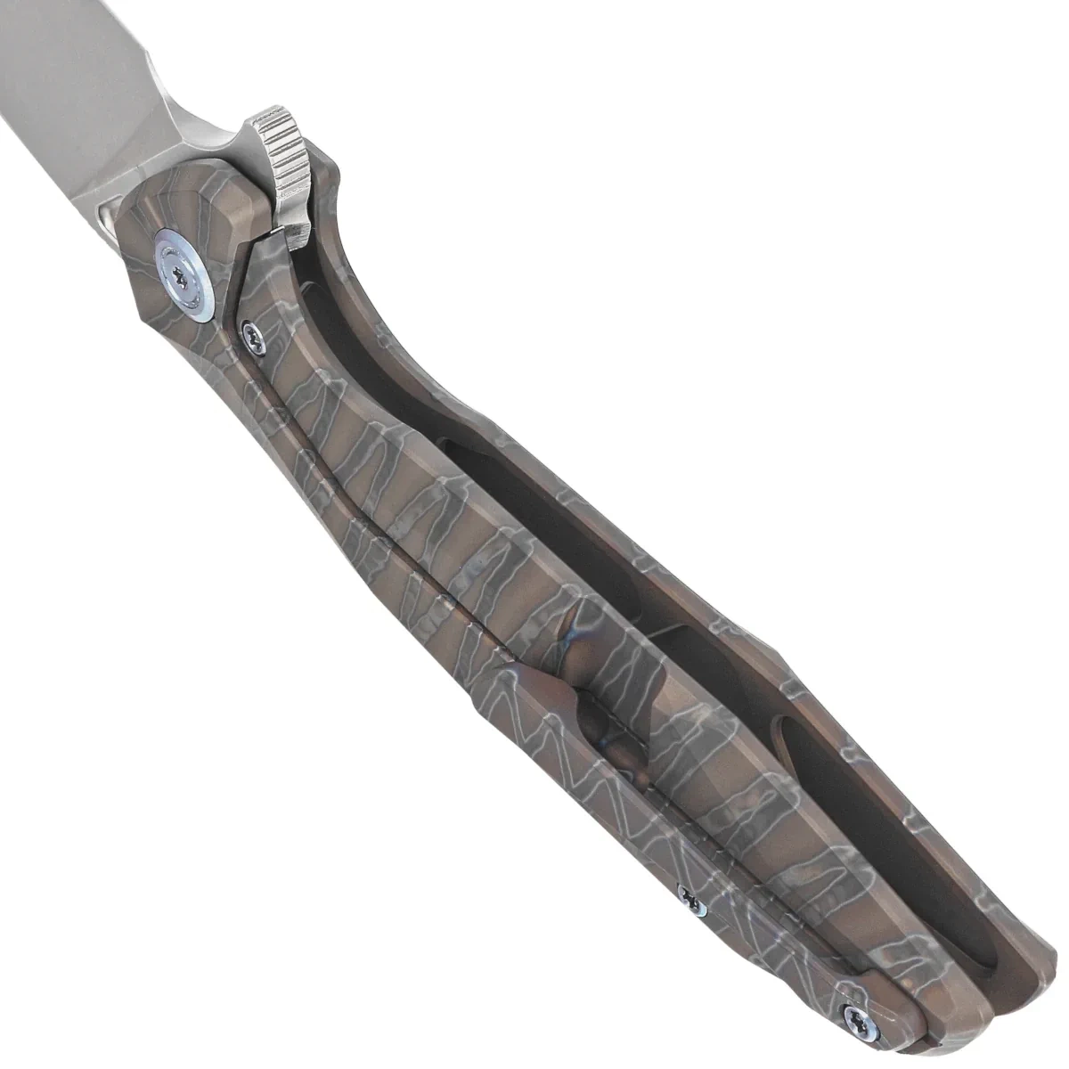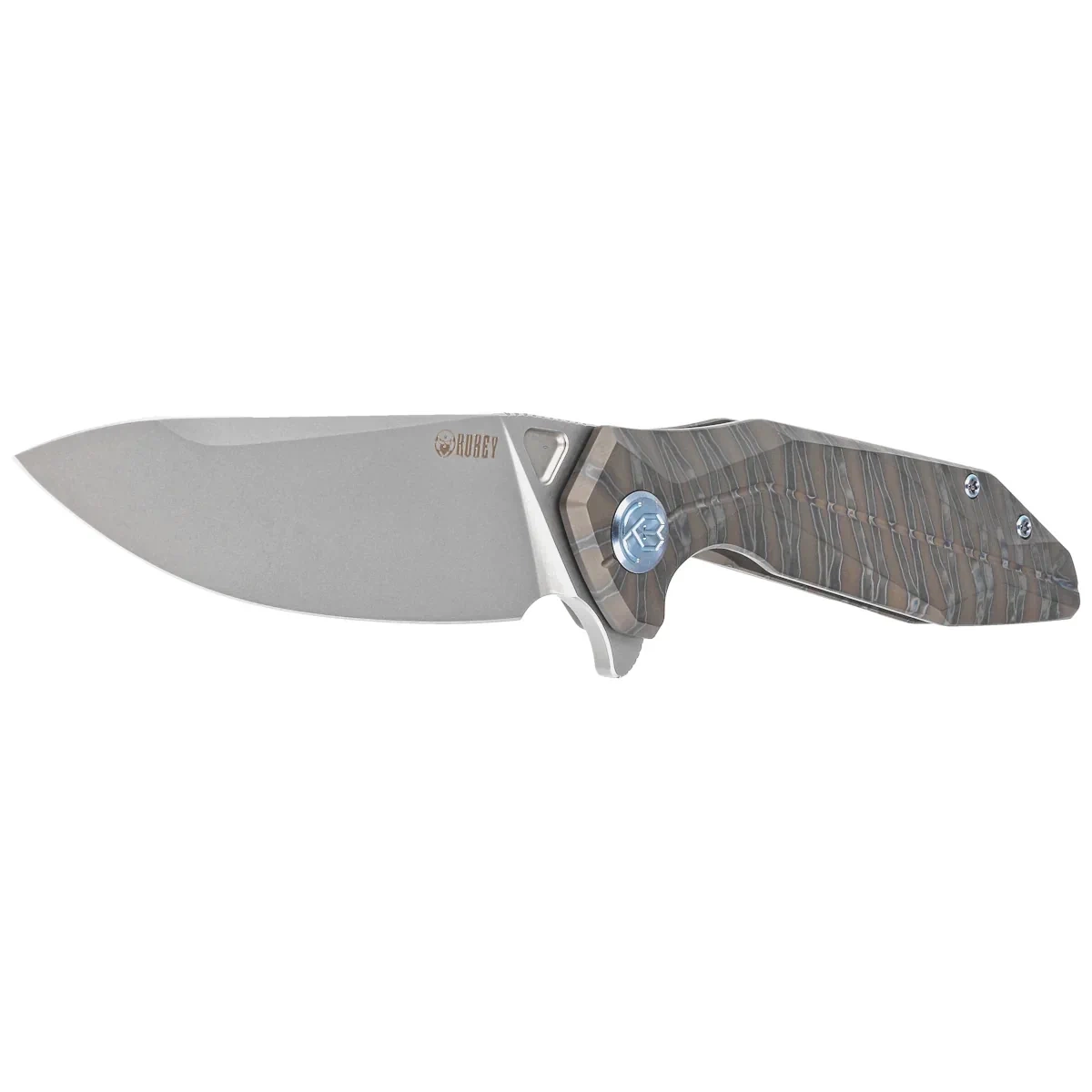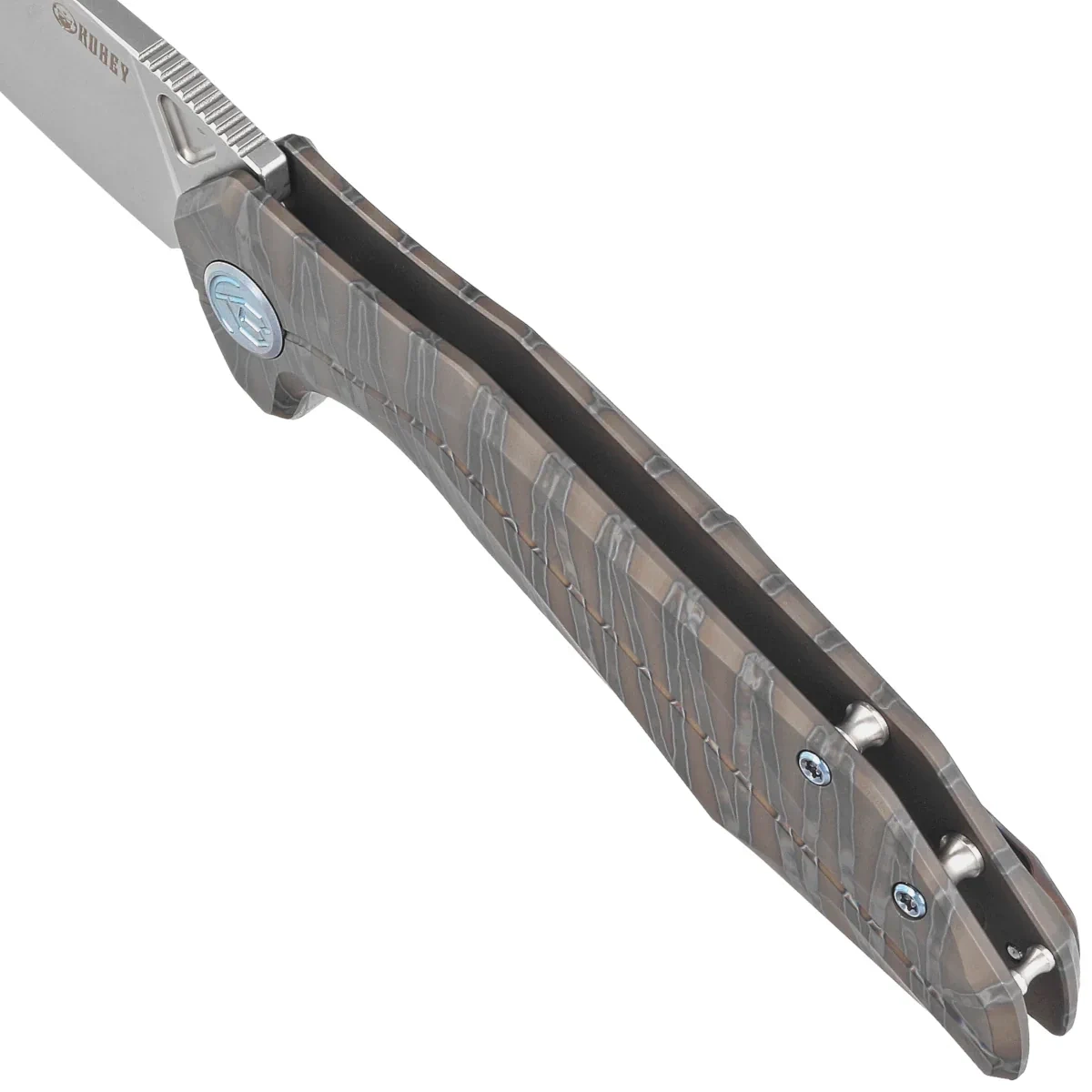 Handle – crafted from two pieces of flame-colored solid 6AL4V titanium, featuring a slightly rough texture for enhanced grip and aesthetic appeal. Chamfered edges of the covers eliminate sharp edges for comfort and improve grip security. The open-backed design, so called, fastened together with steel spacer sleeves, reduces weight and facilitates cleaning. The simple, sturdy design provides assurance of years of use. Deep finger undercut (fore finger groove) improves grip security. The pivot axis is decorated with a stylized Kubey Knife brand logo. A single-position (right) titanium deep-carry clip allows you to carry the knife discreetly in your pocket in blade tip up position.