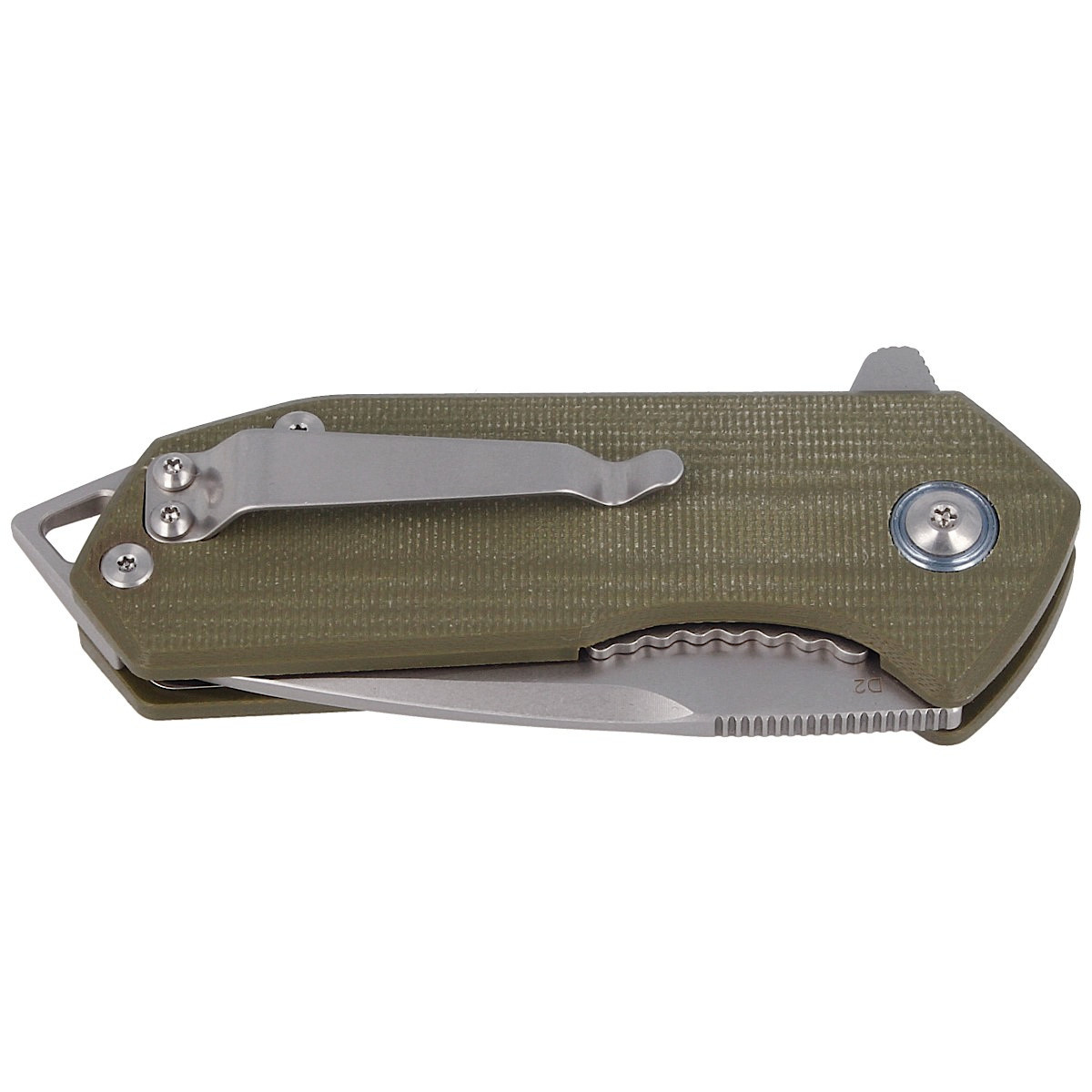 Campe, OD Green G10, Sandblast D2, undersized, rugged EDC knife. Drop point head made of D2 steel, quick flipper opening and G10 handle. Excellent value for money! Bestseller!