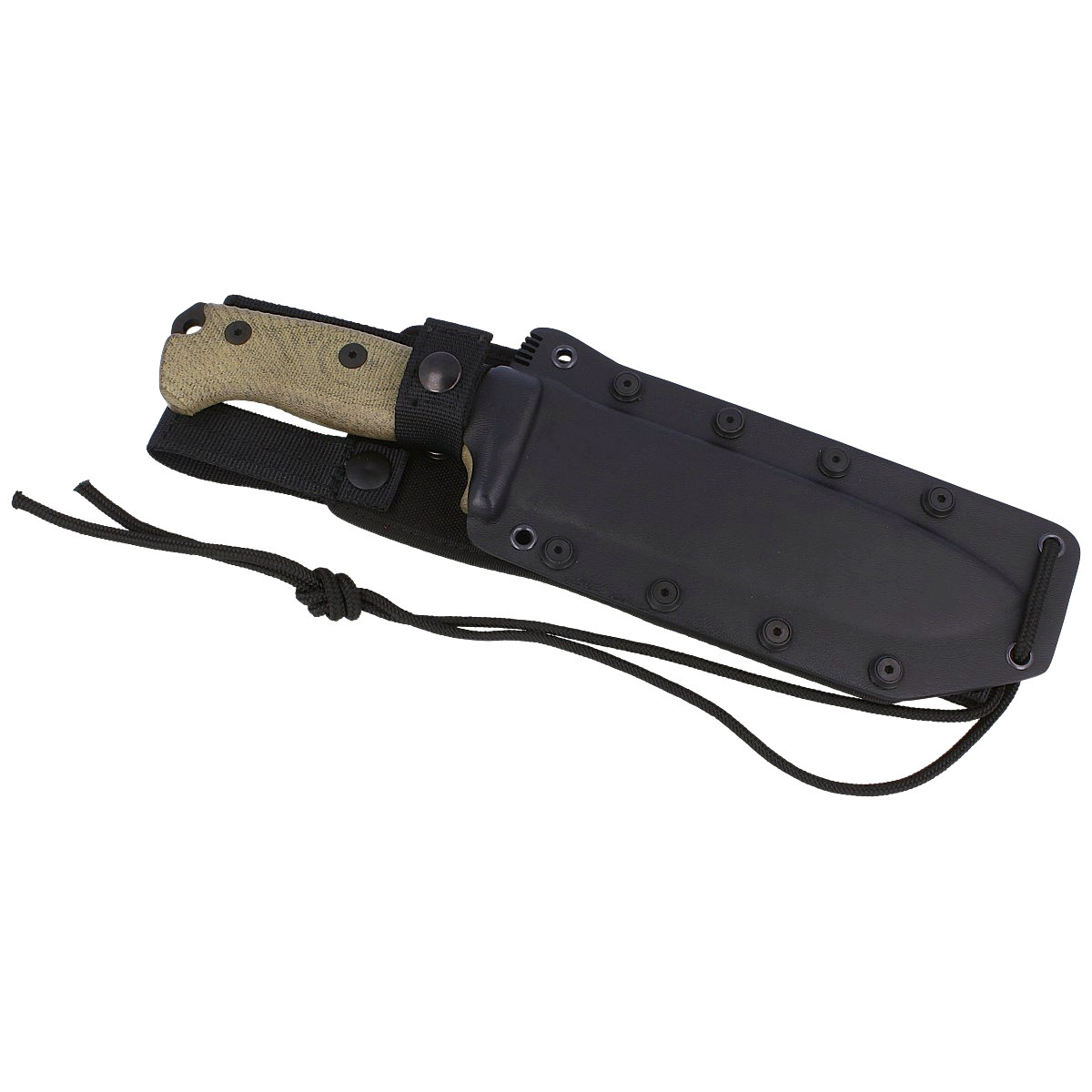 In Solid® Knife technology, derived from a monobloc (one piece) of waterproof micarta (compressed canvas with synthetic resin) machined on a four axis CNC machine. The result is a lightweight, monolithic skeleton (body) of the highest strength, which is a strong, solid structural element. Grip facings are also CNC machined to give an anti-slip texture. On the underside of the handle protrusion / hilt, which protects the hand from slipping on the blade during operation. Flat bolt is useful for starting a fire with flint, in an emergency it can be used as a hammer or glass breaker and with a lanyard hole for a cord.