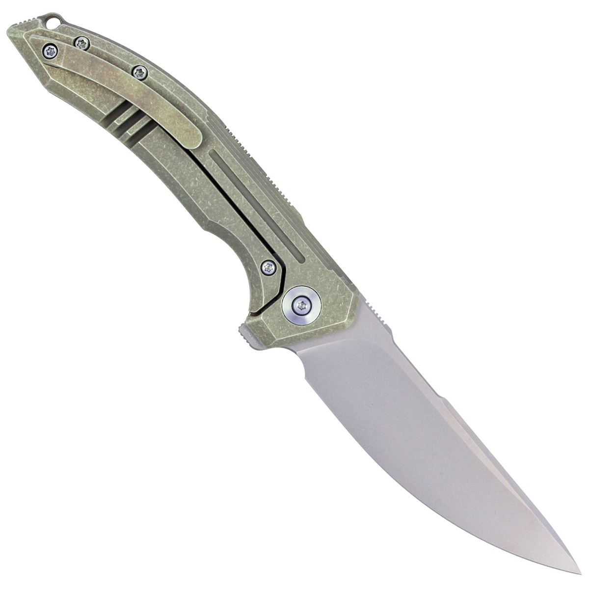 - Quixotic Green Titanium, Silver Bead Blasted top quality EDC knife. Aggressive Drop Point head of CPM 20CV steel. Quick Flipper opening, titanium facings, ceramic bearings. Bestseller!