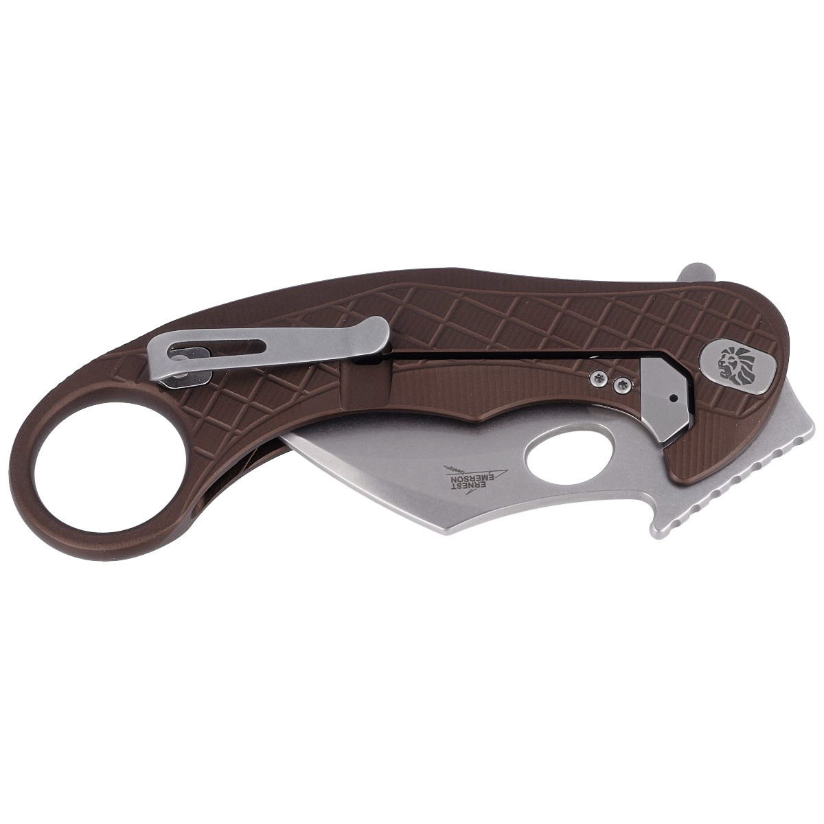 L.E.One (LionSTEEL-Emerson One) Earth Brown Aluminum, Stone Washed the most technically advanced folding karambit in the world! Lionsteel's patented technologies and unique Emerson Design! A unique folder from the Italian manufactory equipped with CPM MagnaCut steel blade, Emerson Wave hook and "ReF" technology flipper.