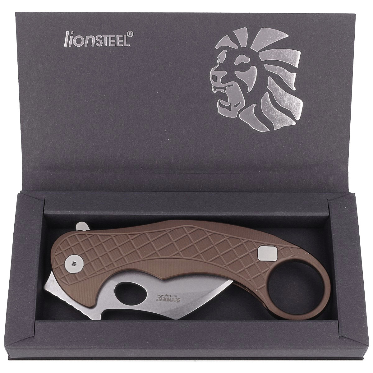 - L.E.One Karambit Brown Aluminium, Stone Washed MagnaCut the most technically advanced folding karambit in the world! CPM MagnaCut steel, Ergal aluminum in aged bronze. Lionsteel's patented technologies and unique Emerson Design.
