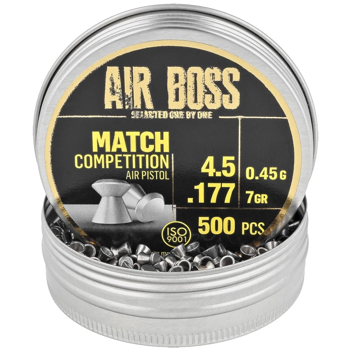 Air Boss Match Competition Air Pistol 4.5mm hand-sorted match-grade flat-head pellets. With an optimized weight, they are perfect for sport pneumatic pistols but are also suitable for pneumatic rifles. Pack of 500 pcs.