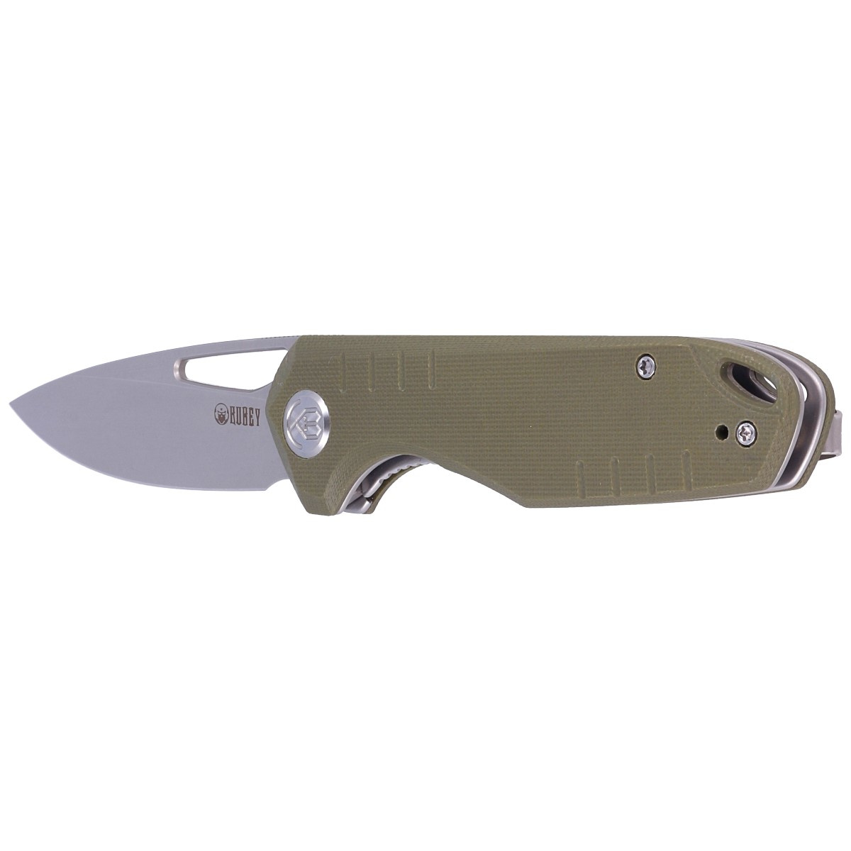 Handle - green G10 (pressure-pressed fiberglass with synthetic resin) facings, textured to improve grip security, bolted to the knife's steel frame. The open-backed design, so called, fastened together with steel spacer sleeves, reduces weight and makes cleaning easier. The simple, sturdy design gives assurance of many years of use. The pivot axis is decorated with a stylized manufacturer's logo. A two-position (right/left) metal deep-carry clip allows you to carry the knife discreetly in your pocket in tip-up position (blade tip up). Above the clip a lanyard hole, a hole for threading a safety or decorative cord.