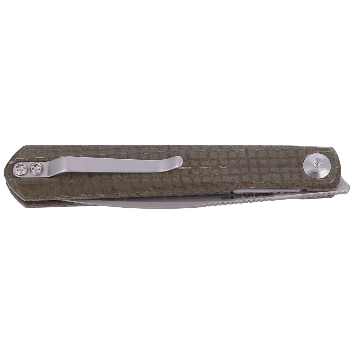 Handle - green burlap Micarta (pressure-pressed jute with synthetic resin) liners, which were screwed to steel liners. Contouring of the covers eliminates sharp edges for comfort and sure grip. The so-called open-backed design without the typical backspacer, fastened together with steel spacer sleeves for easy cleaning. The simple, secure design gives you the confidence of years of use. The deep-carry, two-position (right/left) clip allows you to carry the knife in tip-up position (tip up).