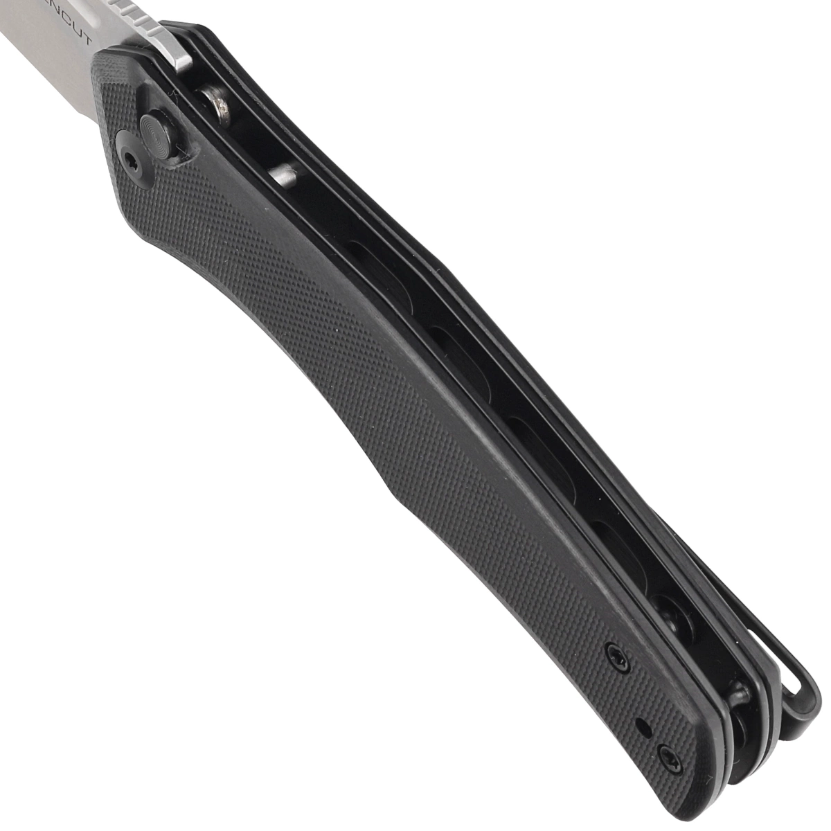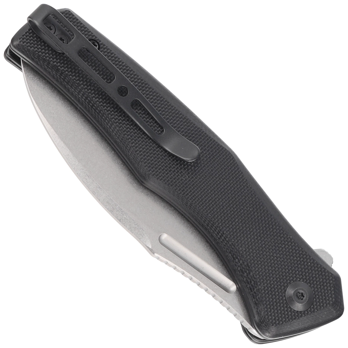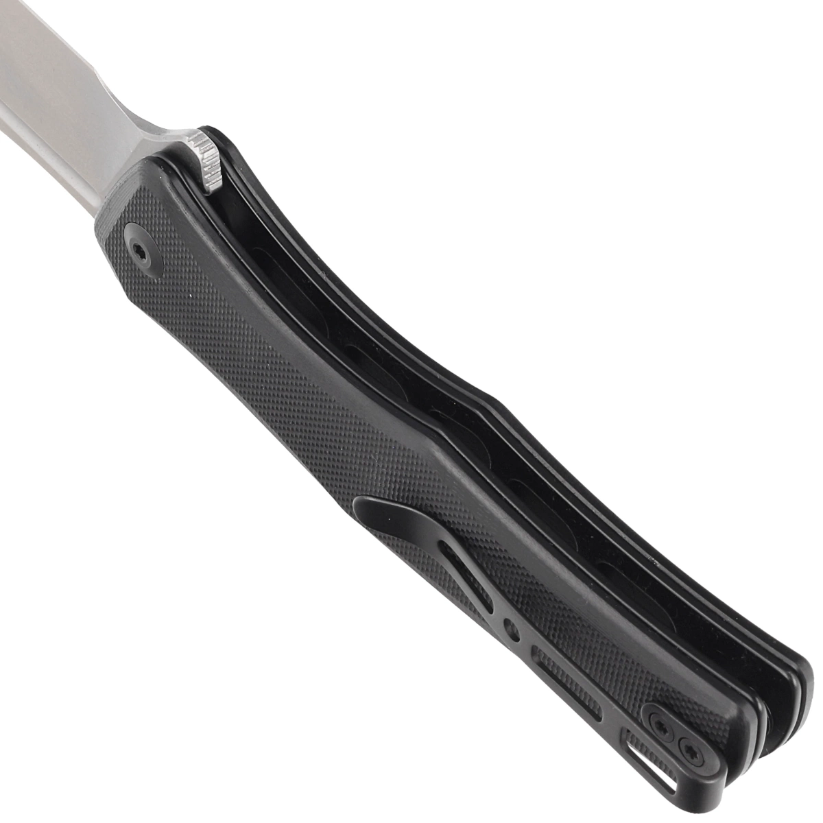 Handle - in black color. Made of G10, a composite fiberglass material compressed under pressure with synthetic resin. Chamfered cover edges eliminate sharp edges for comfort, grip. Open-backed design attached with steel spacer sleeves reduces weight and facilitates cleaning. Two-position, right/left deep carry clip allows you to carry the knife discreetly in your pocket in tip-up position (tip of the blade upward).