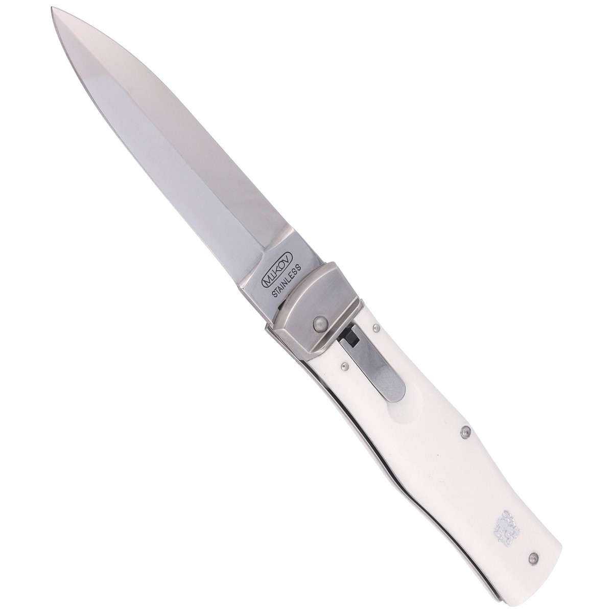 - Predator White ABS, Mirror, automatic knife from Mikov. Robust durable construction strong opening springs, characteristic click when opening the blade distinguish Predator from other spring knives. Clip for carrying in pocket.